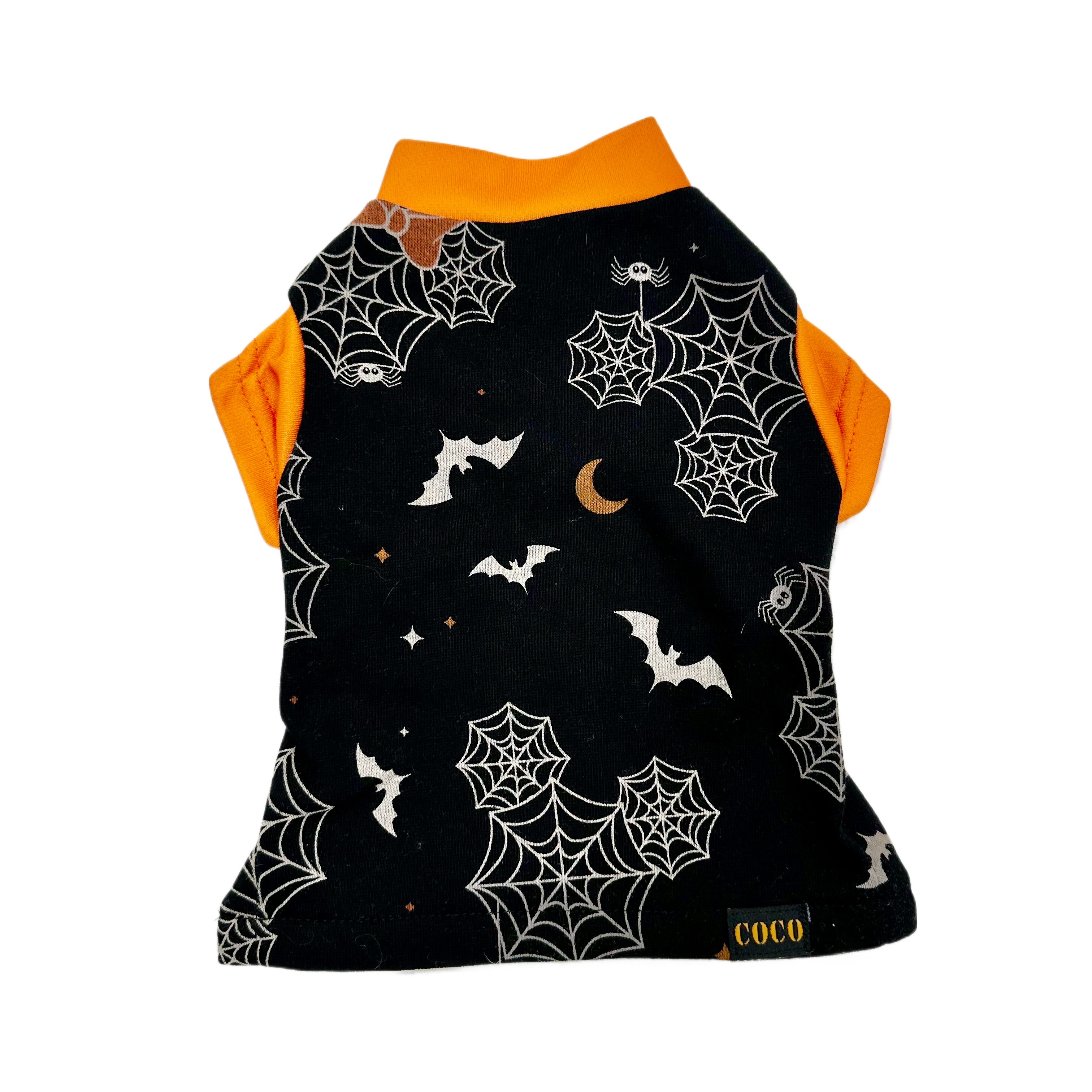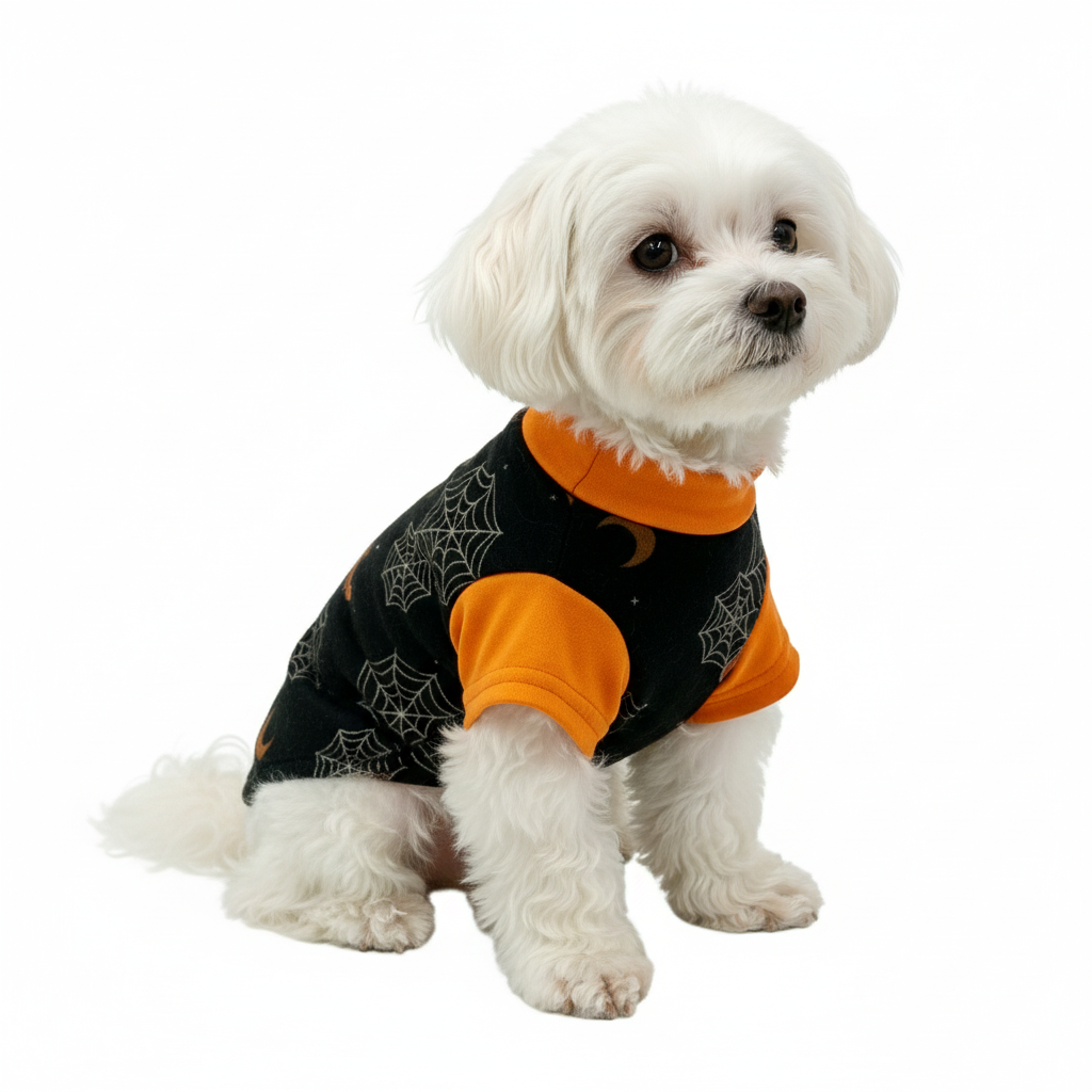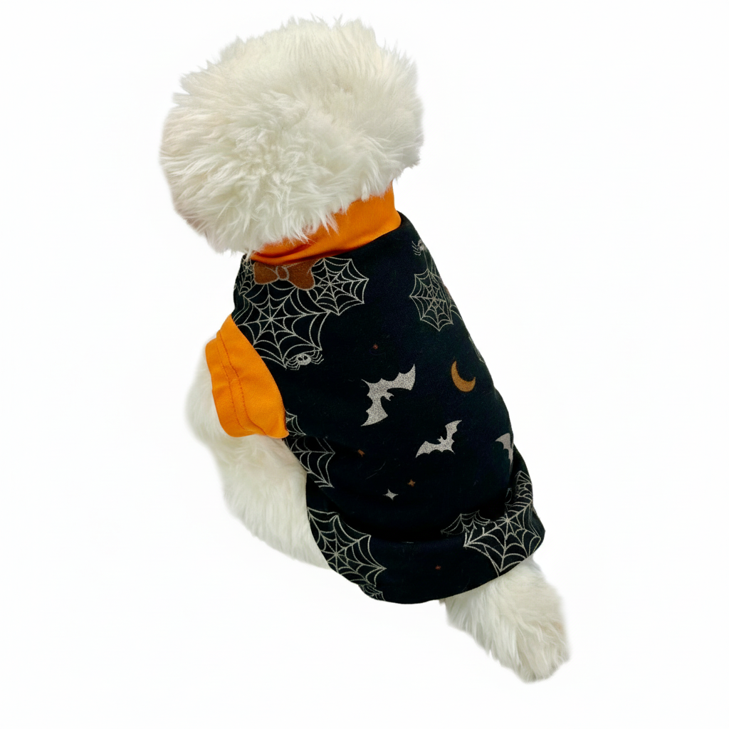 Festive Halloween pet shirt with an orange collar and sleeves and a spiderweb and bat print