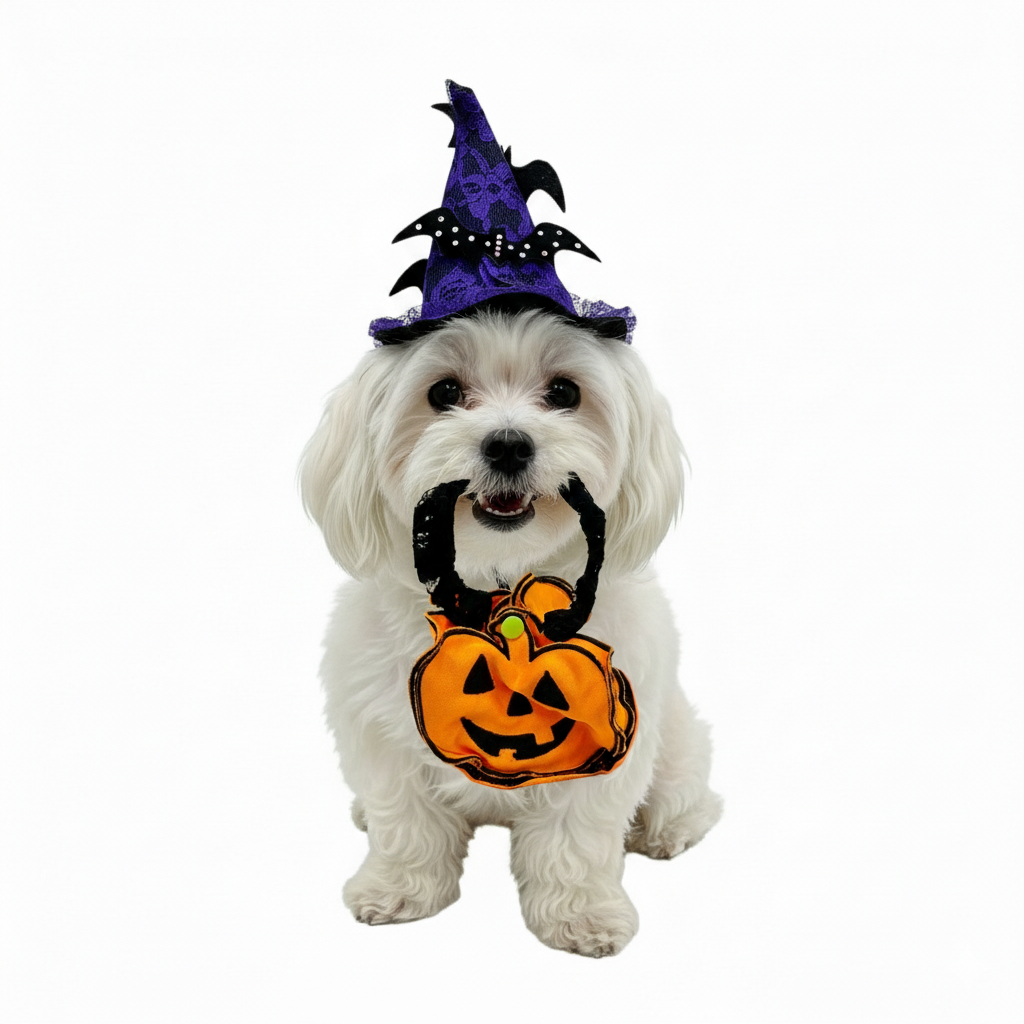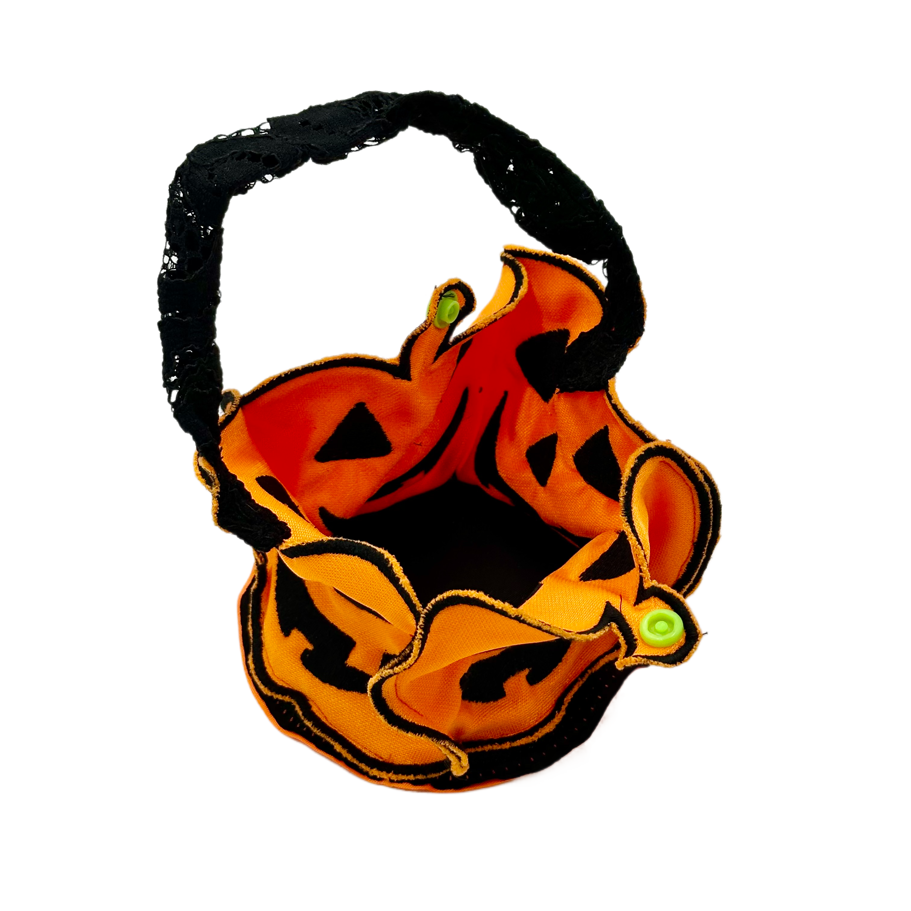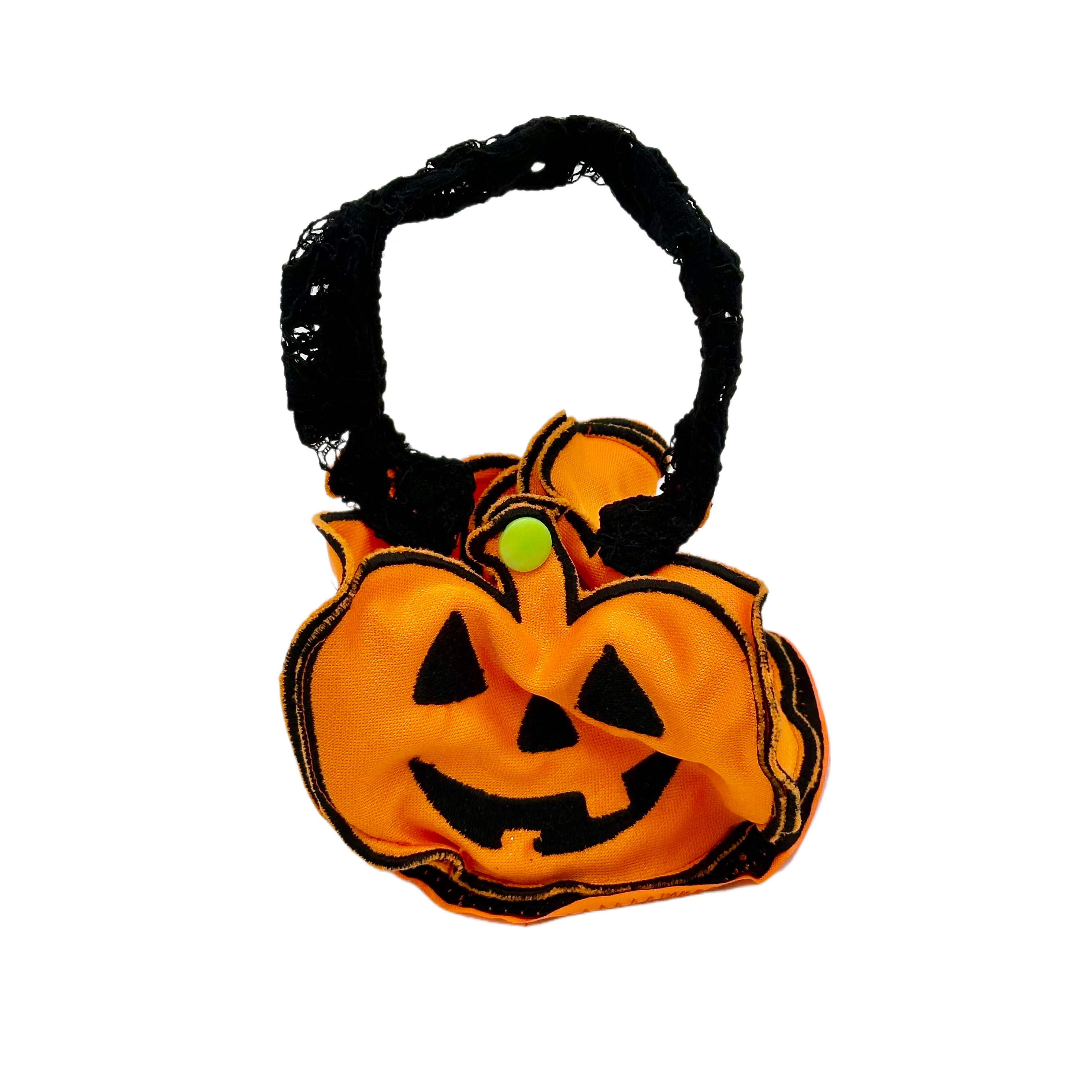 Festive miniature orange pumpkin trick-or-treat basket for pets with a black lace handle