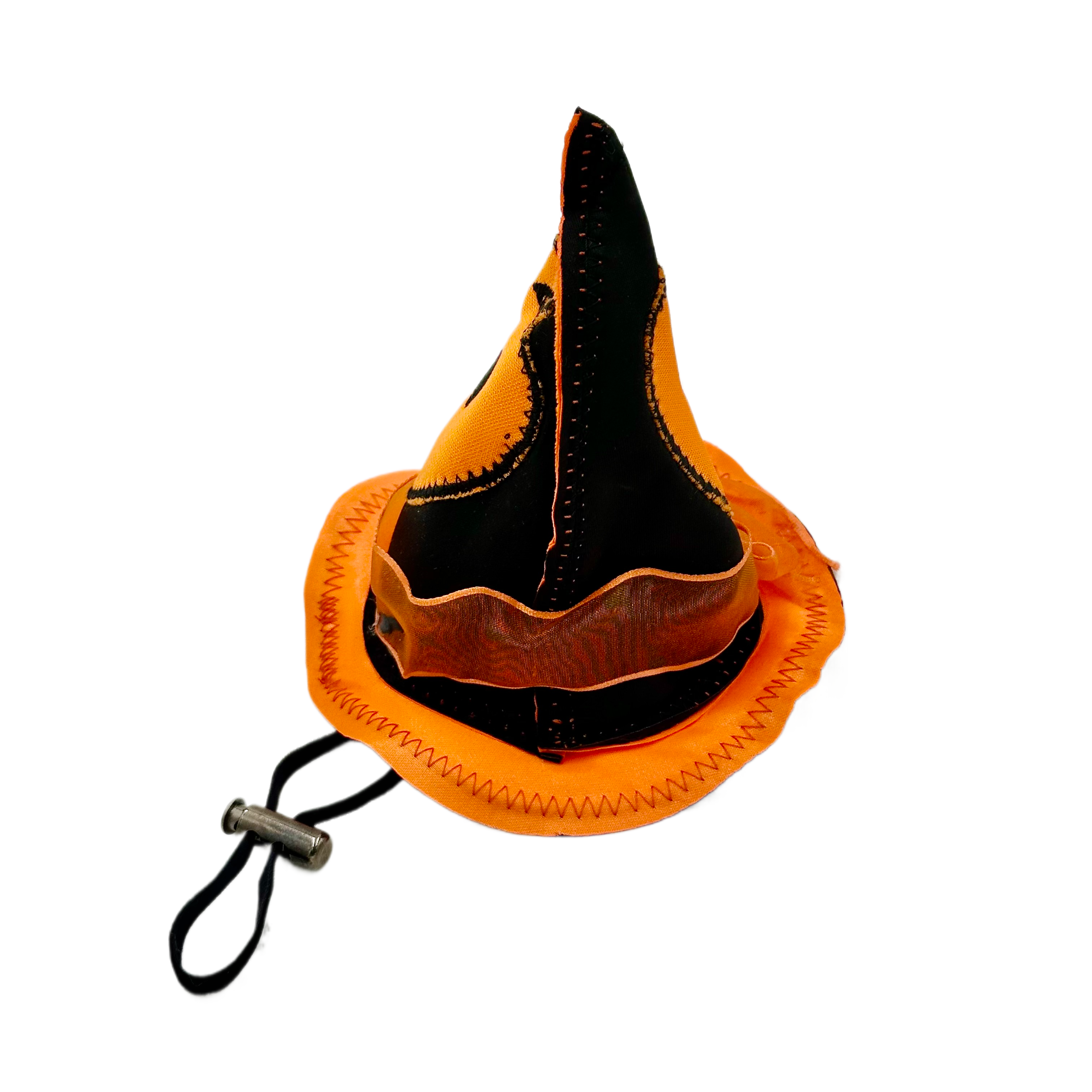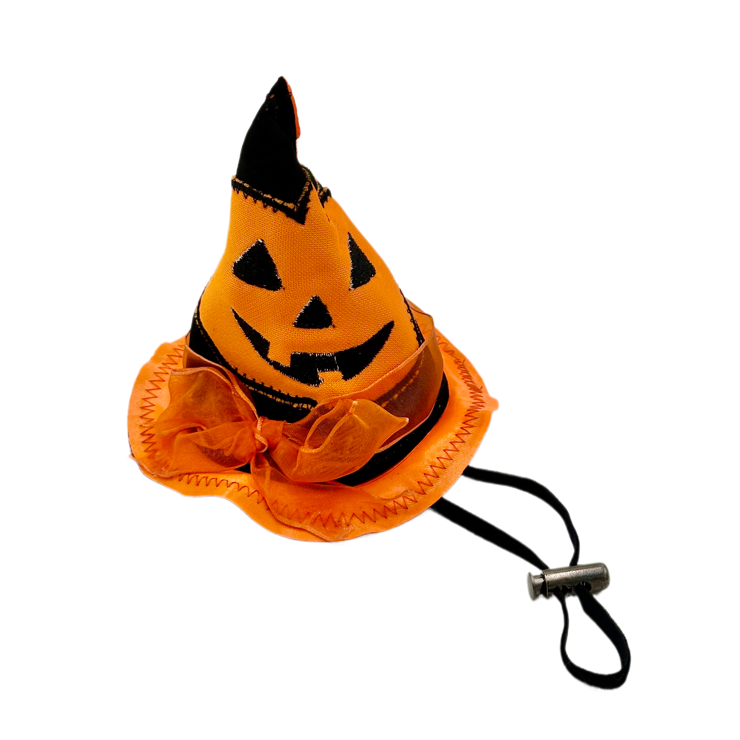 Festive Halloween pet hat shaped like a jack-o'-lantern witch's hat with an orange organza bow