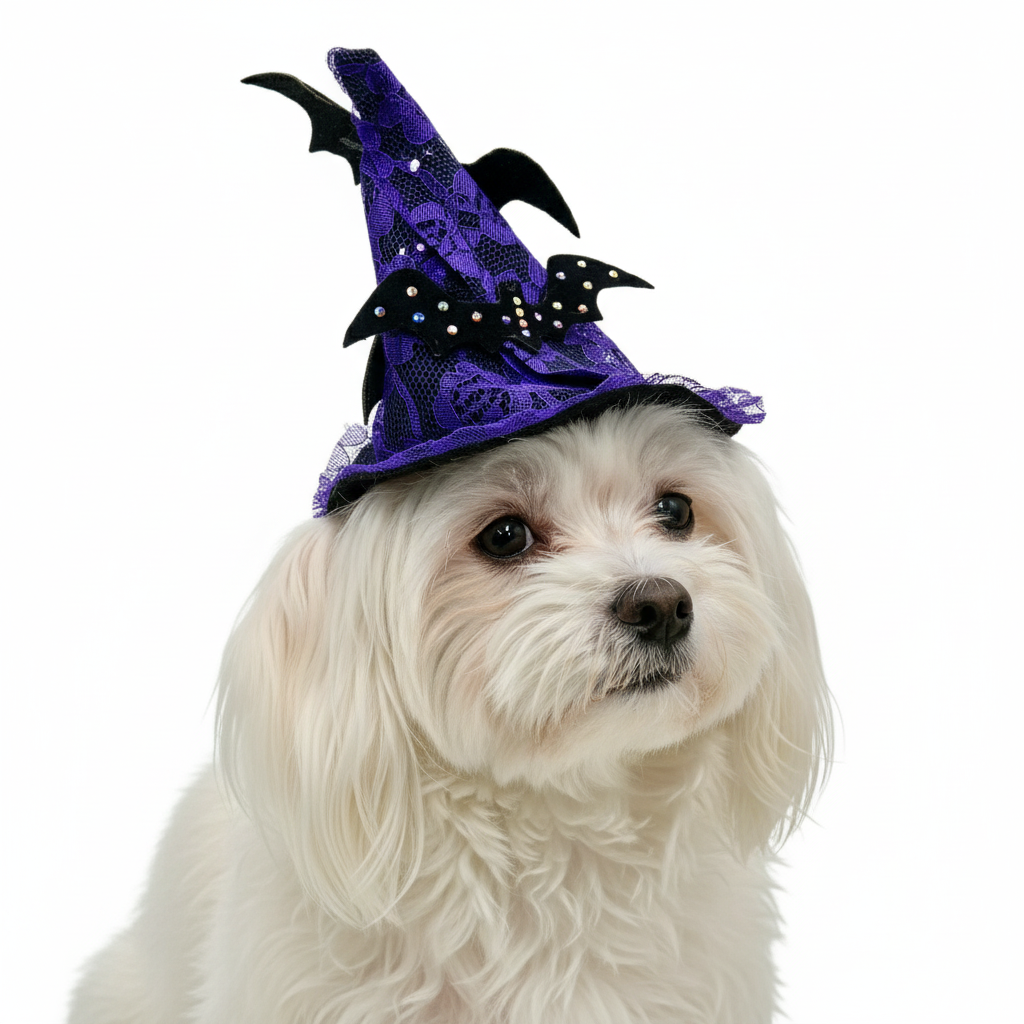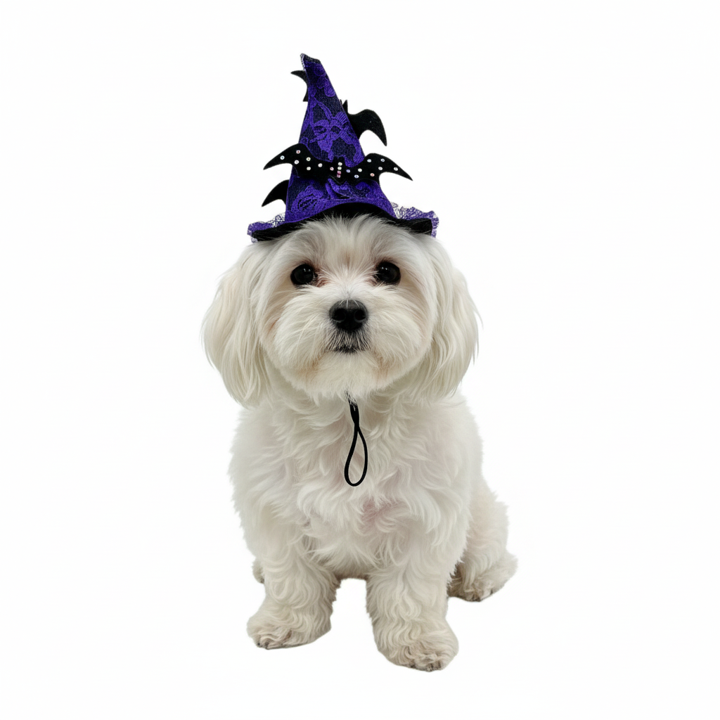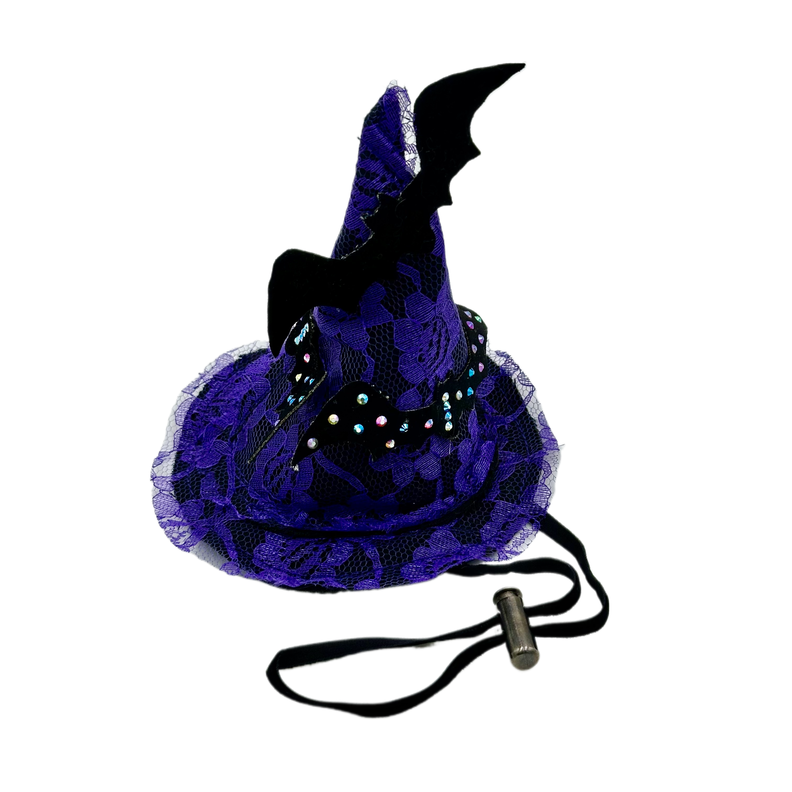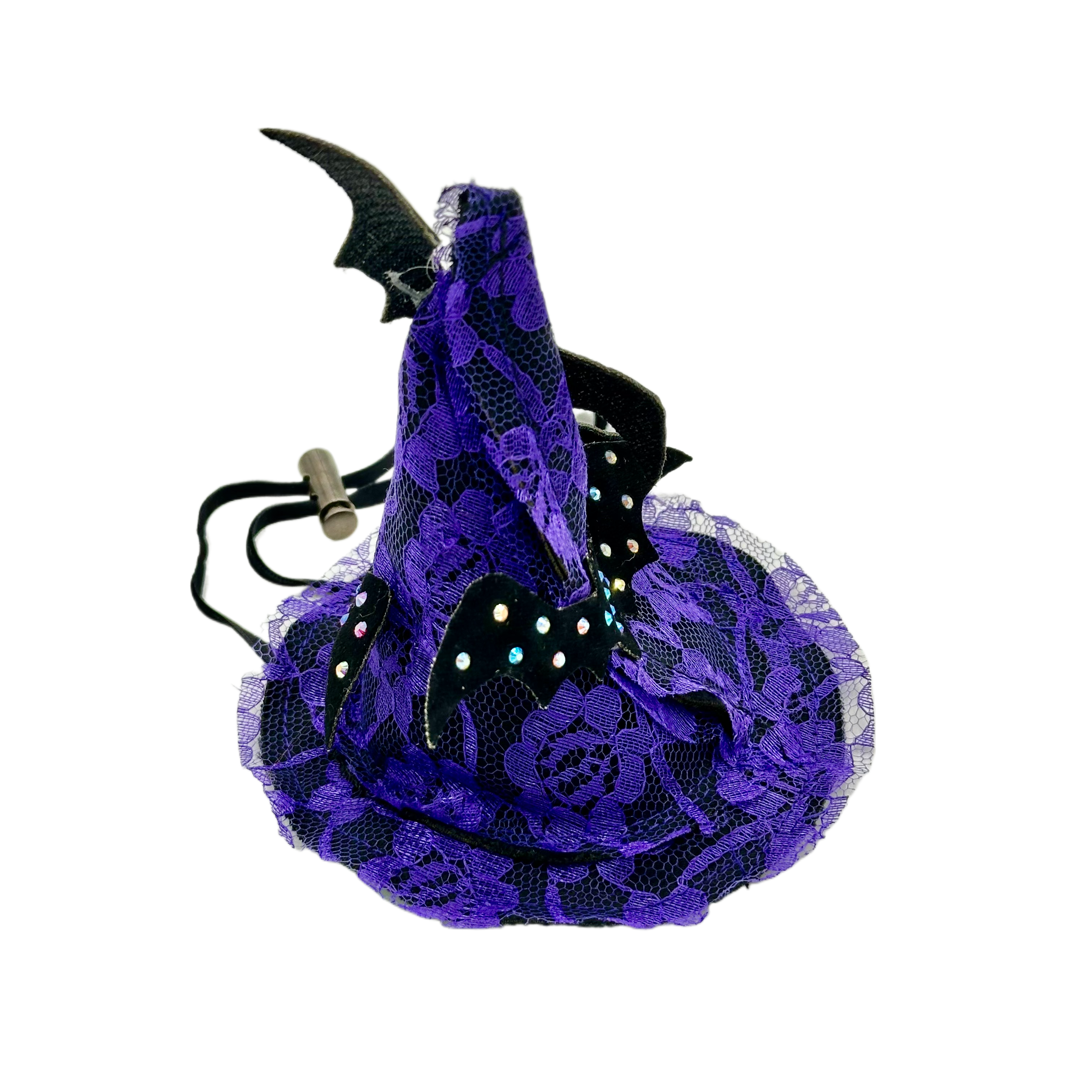 Spooky purple lace pet witch's hat featuring a black bat appliqué and shimmering rhine stones