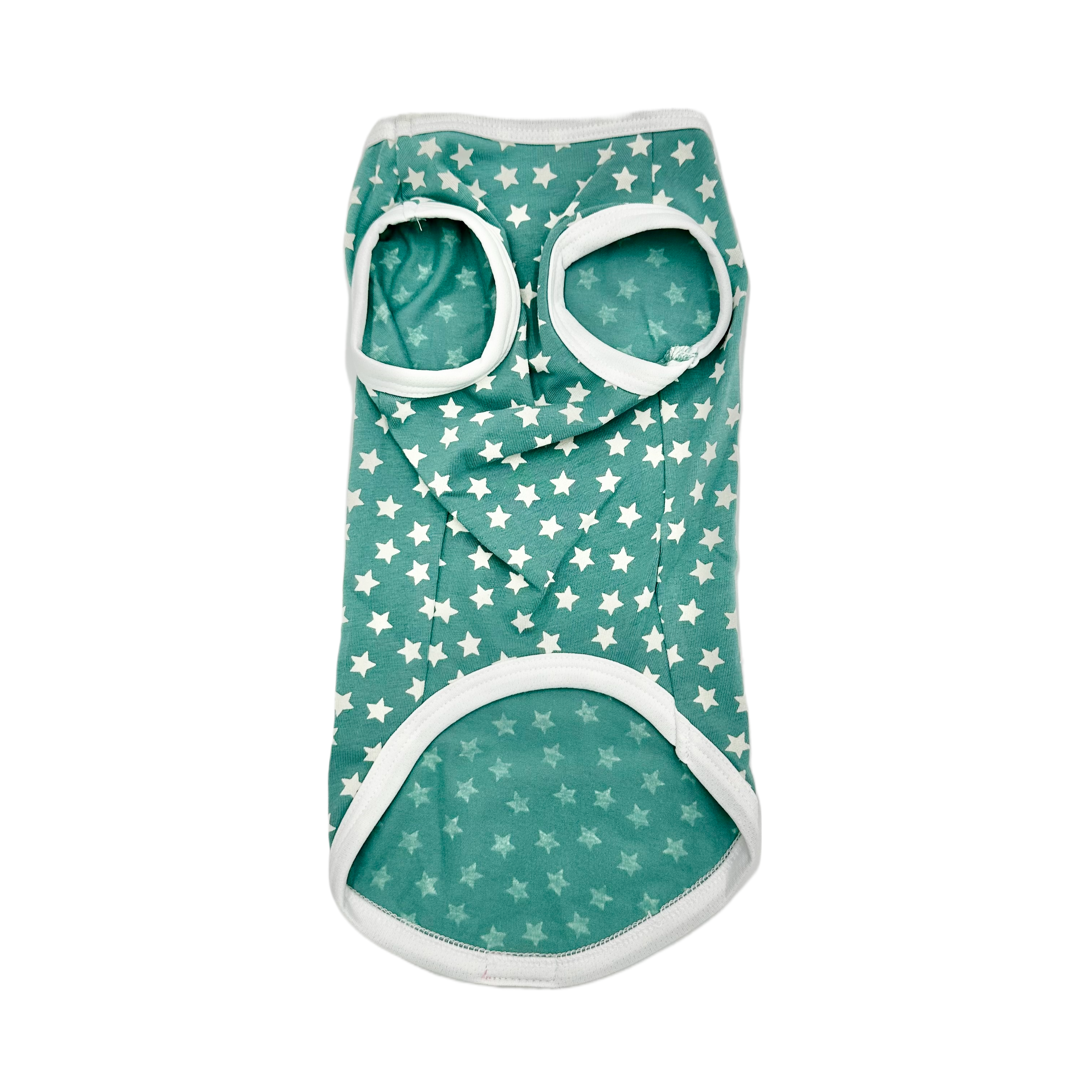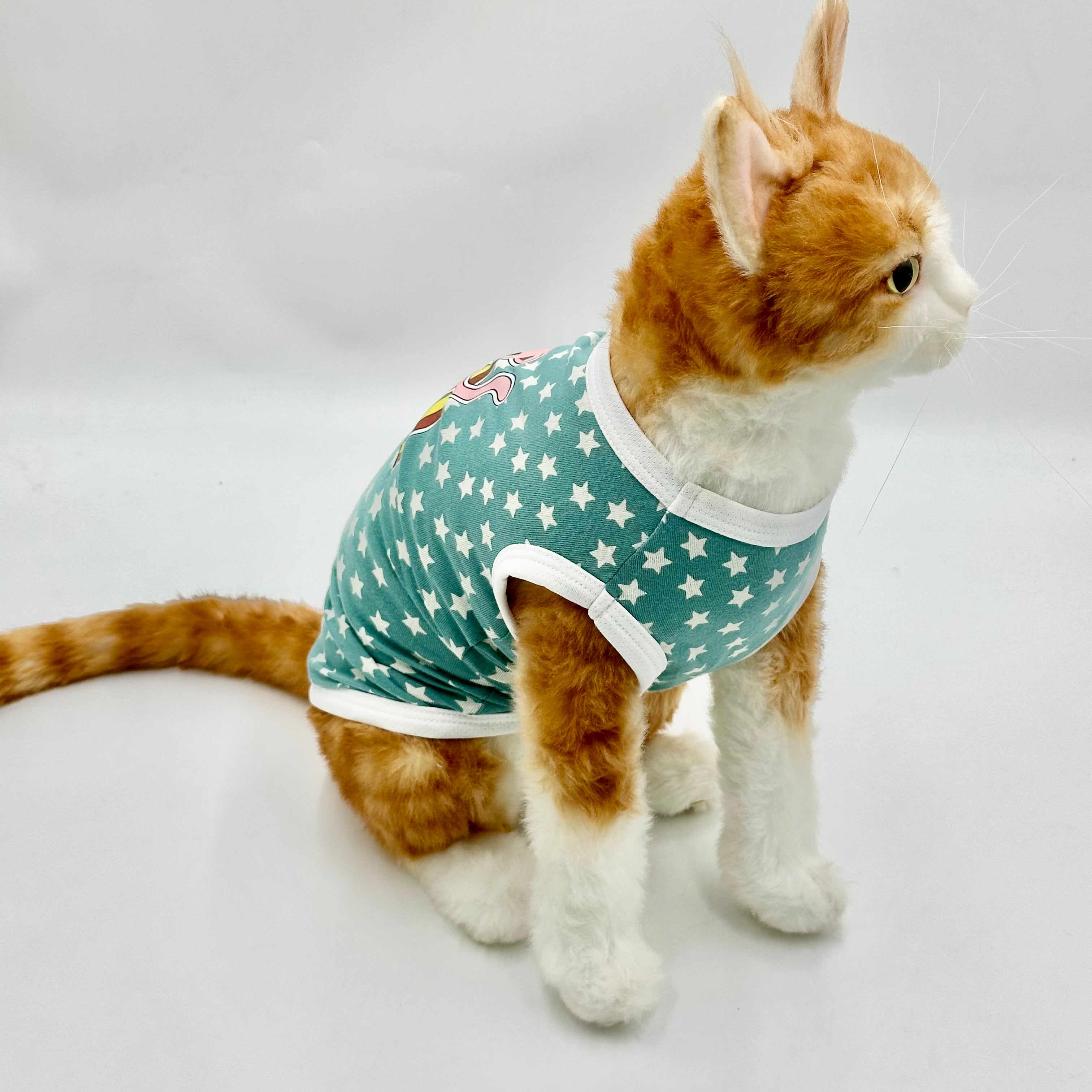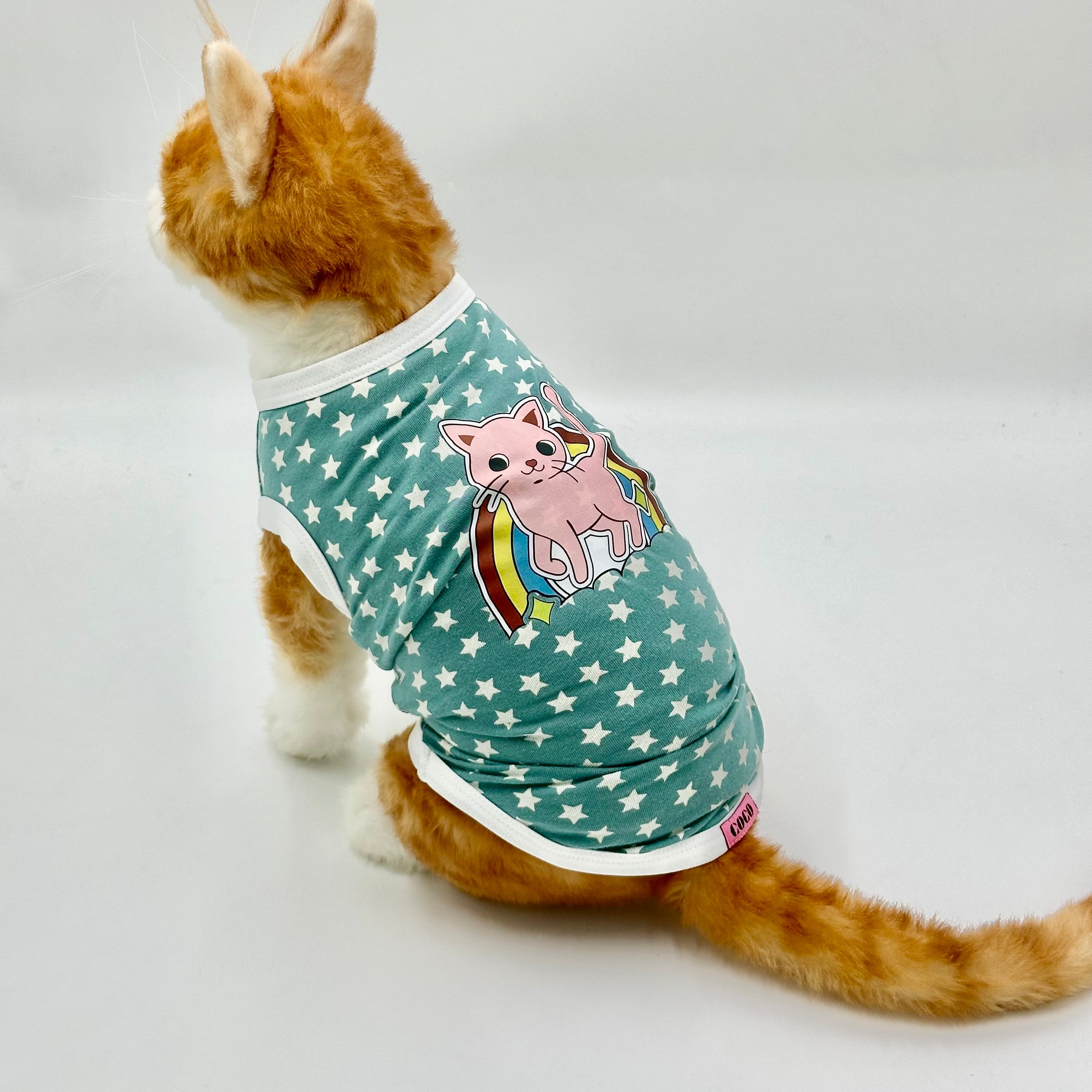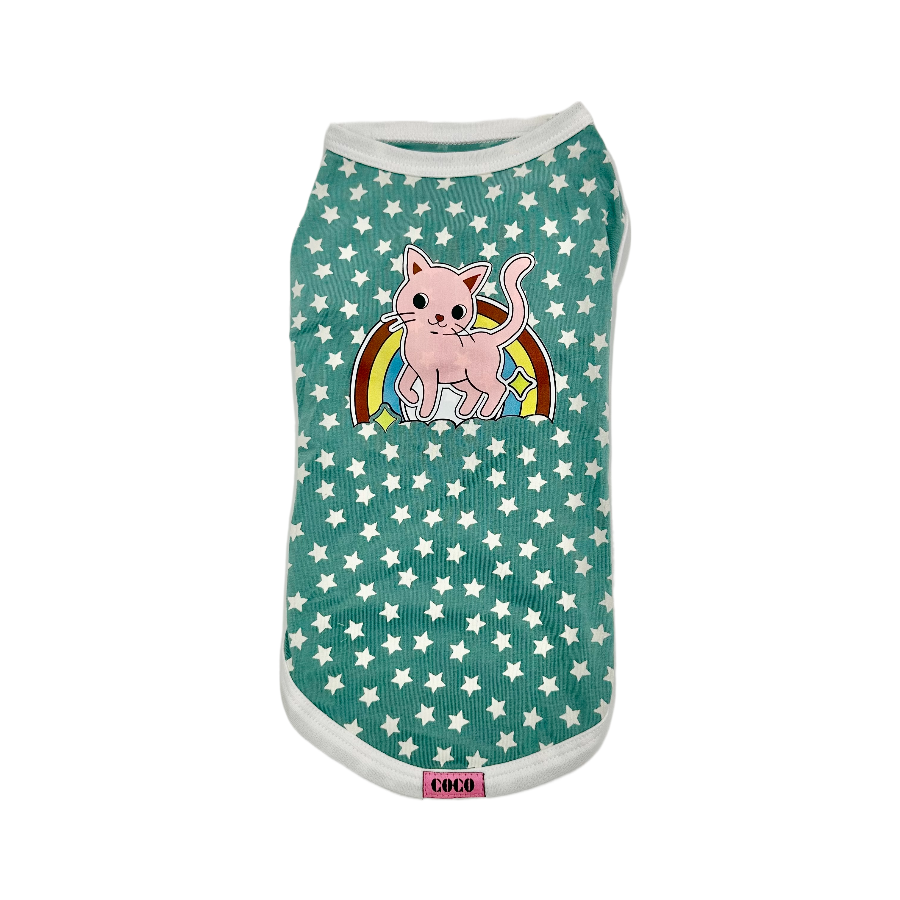 Adorable green pet jersey with a white star pattern and a charming pink cat standing on a rainbow graphic