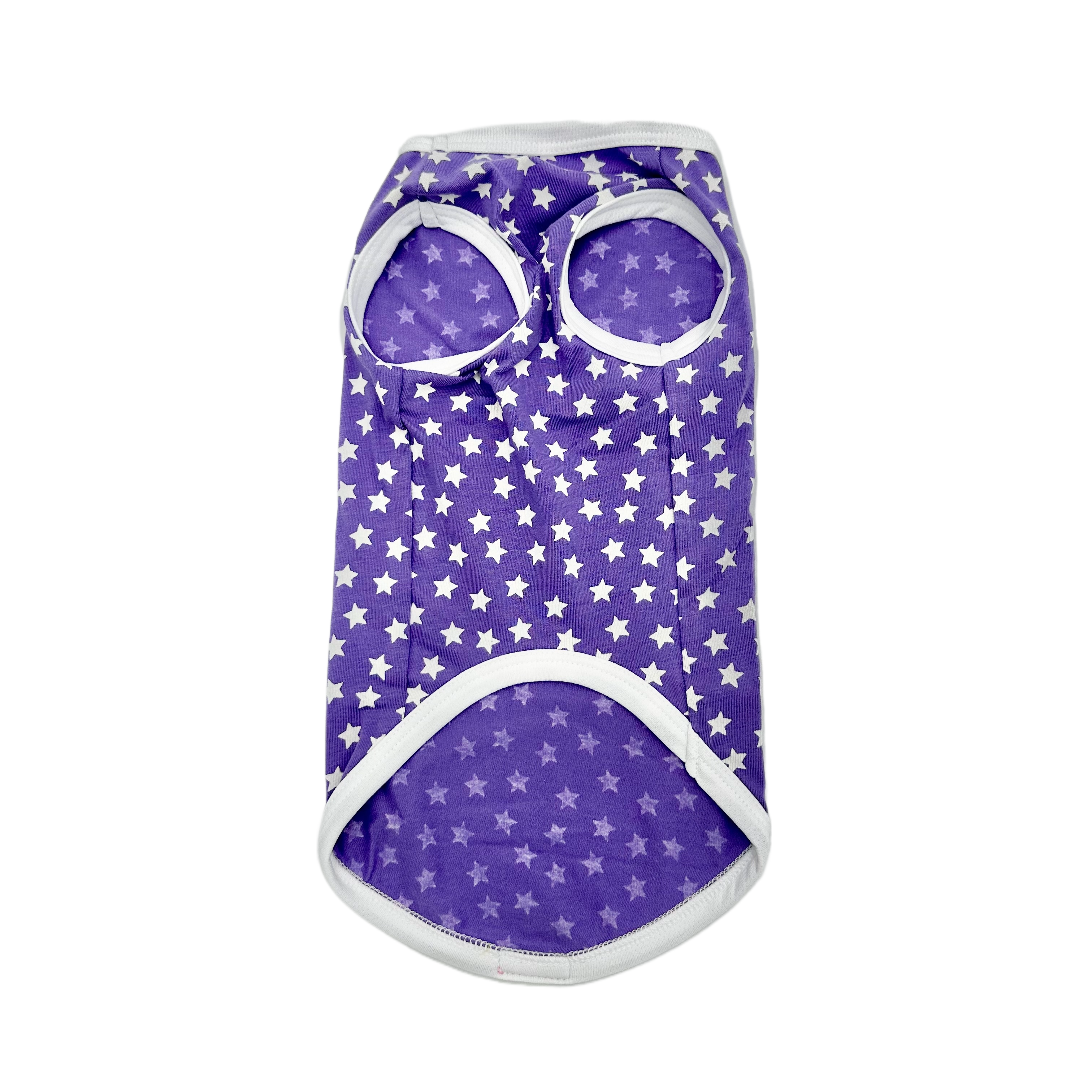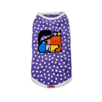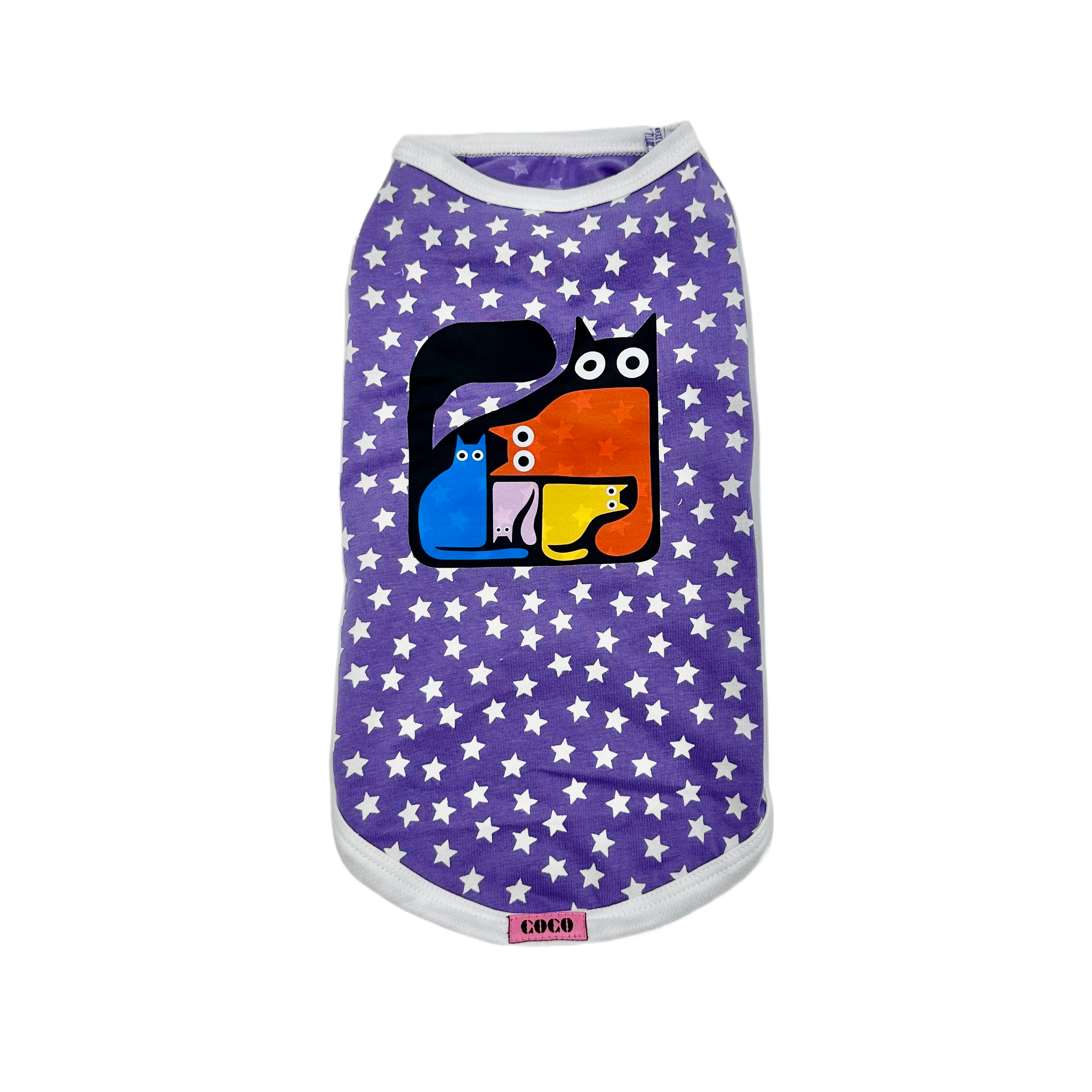 Charming purple pet jersey with a white star pattern and a colorful graphic of four stylized cats