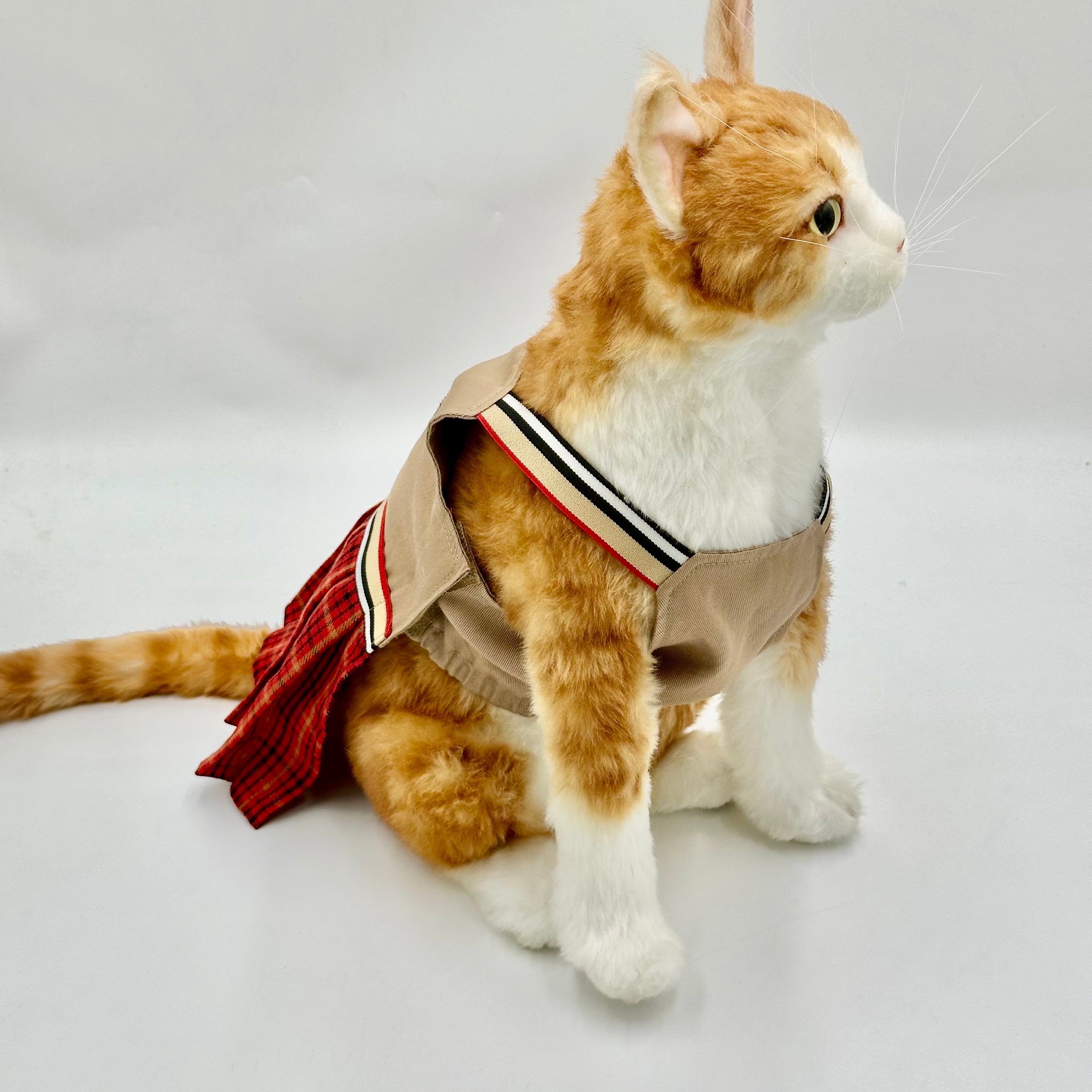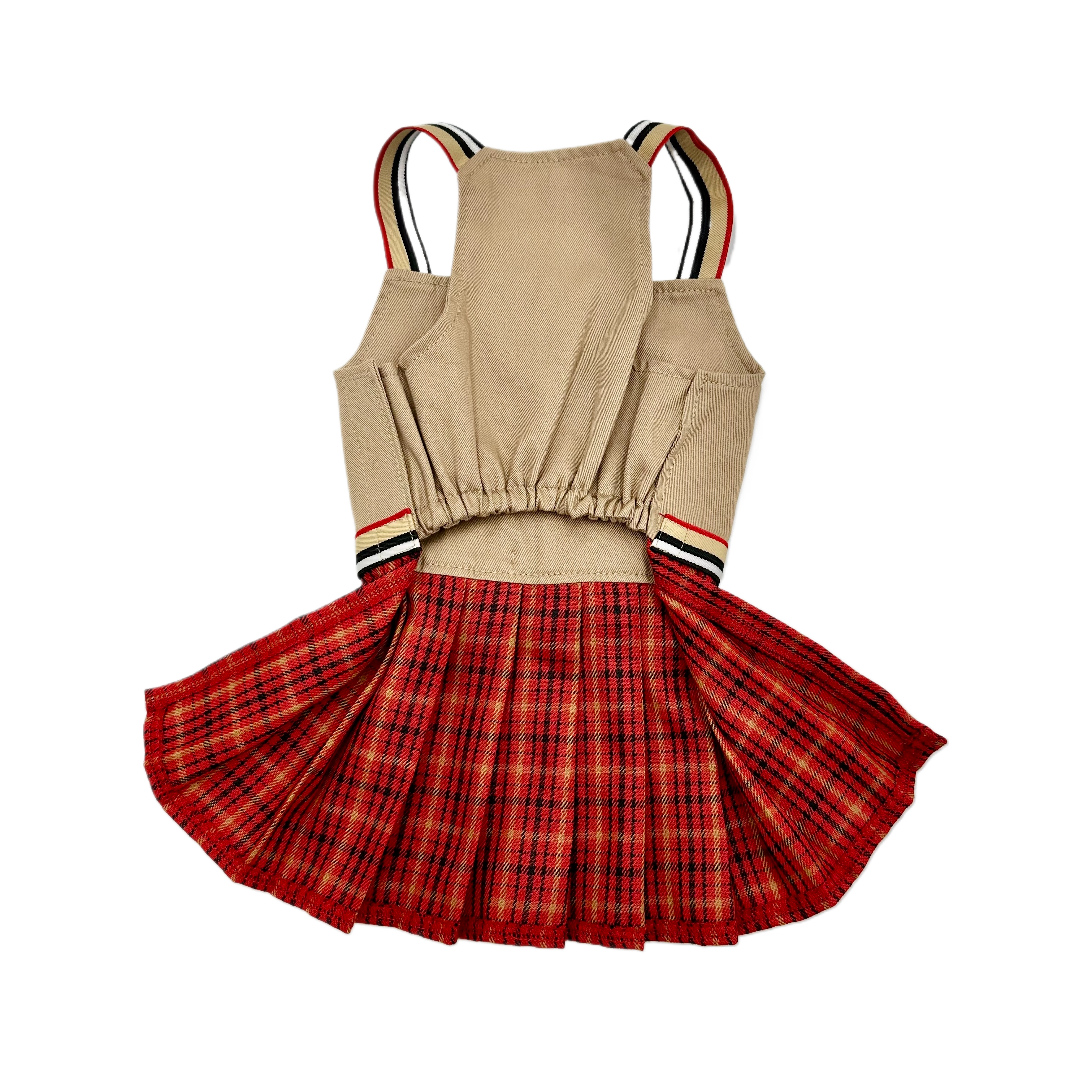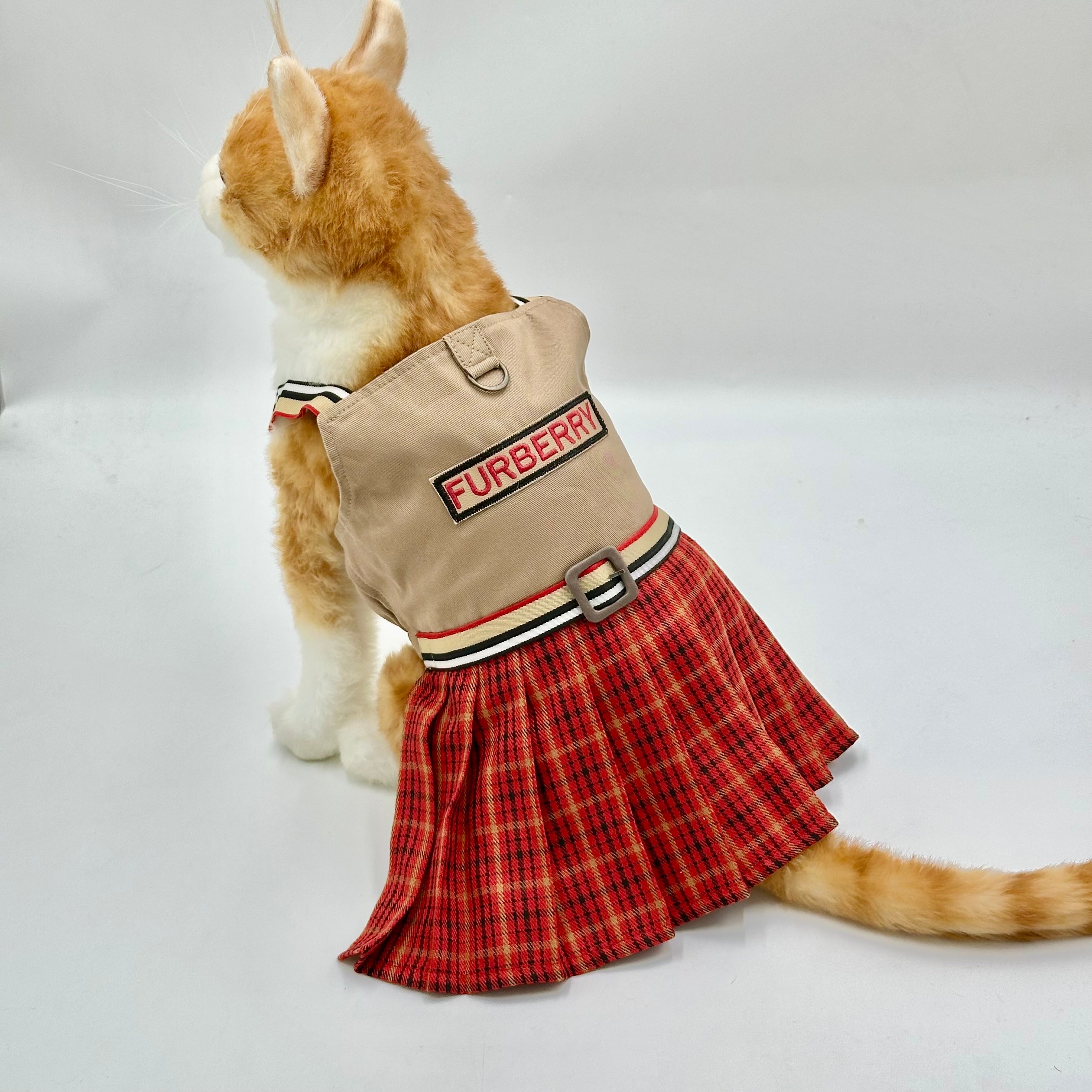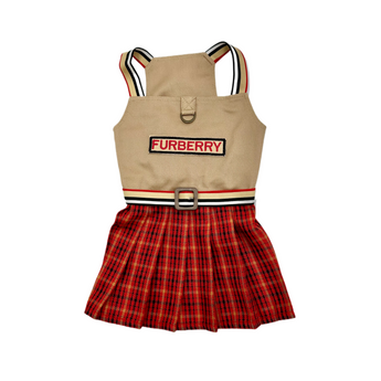 Pet dress with a beige top with "FURBERRY" and a red plaid skirt with a belt, exuding a stylish, preppy look