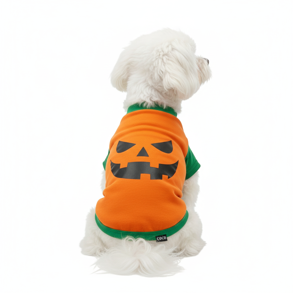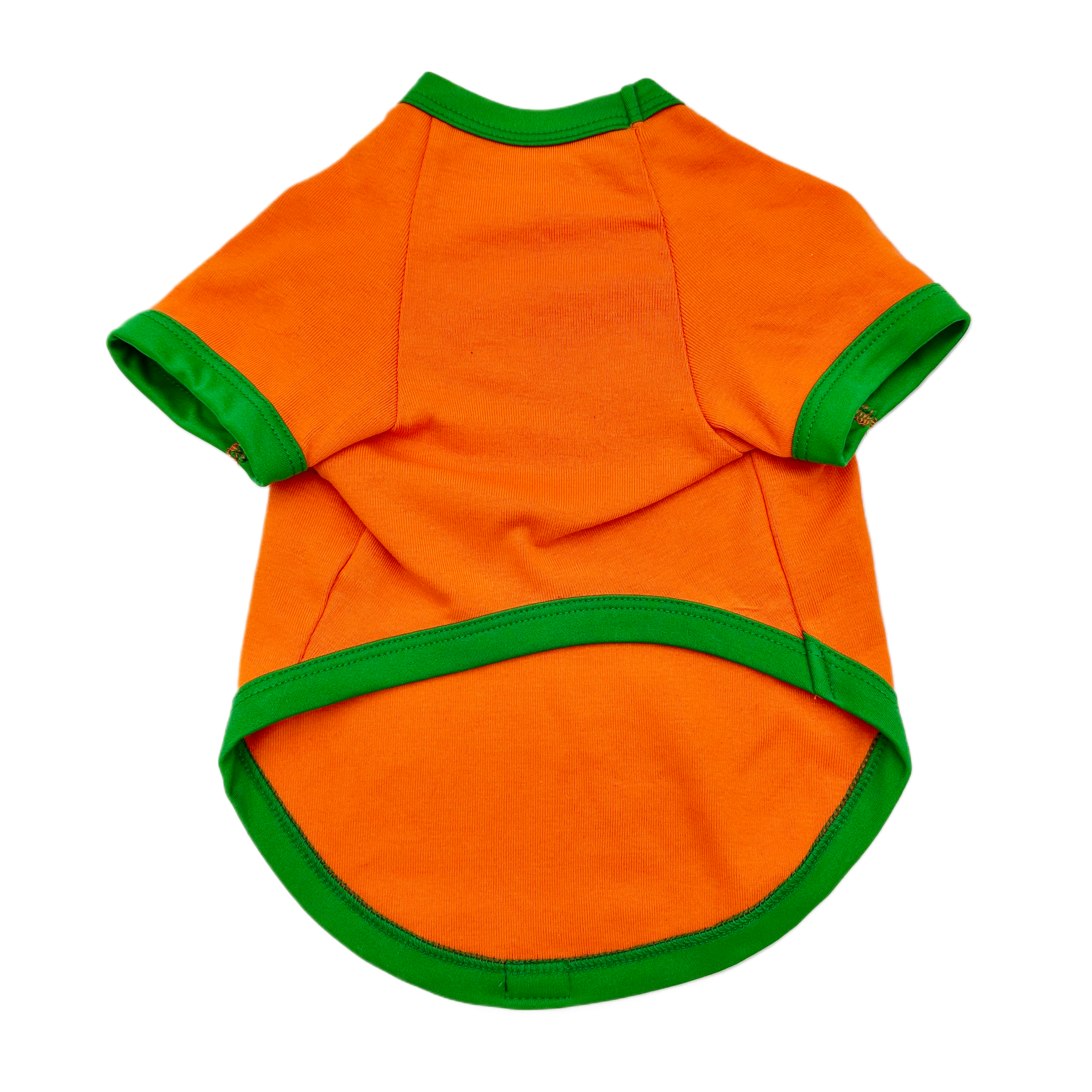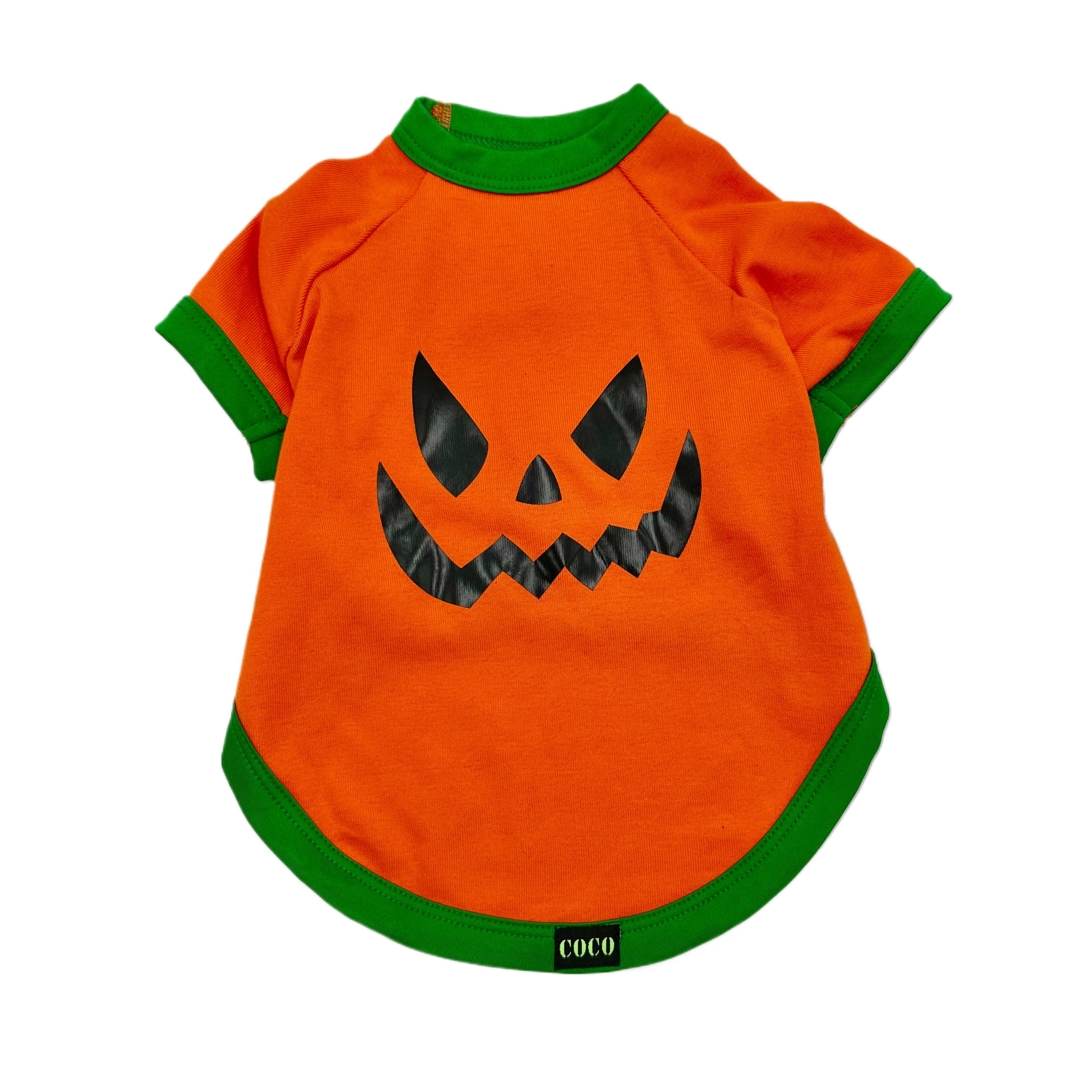 Festive orange pet tee with green trimmings and a spooky black jack-o'-lantern face graphic on the back