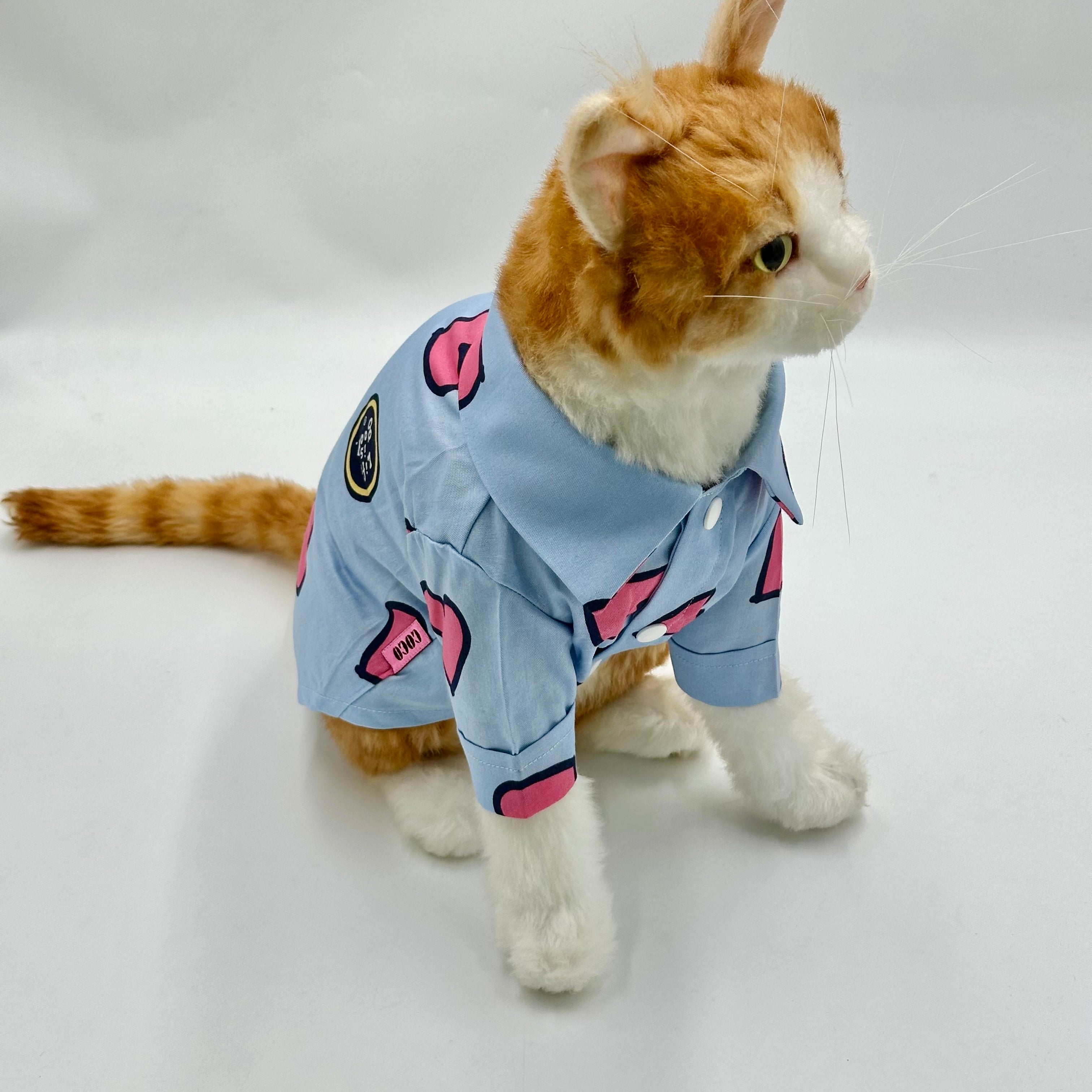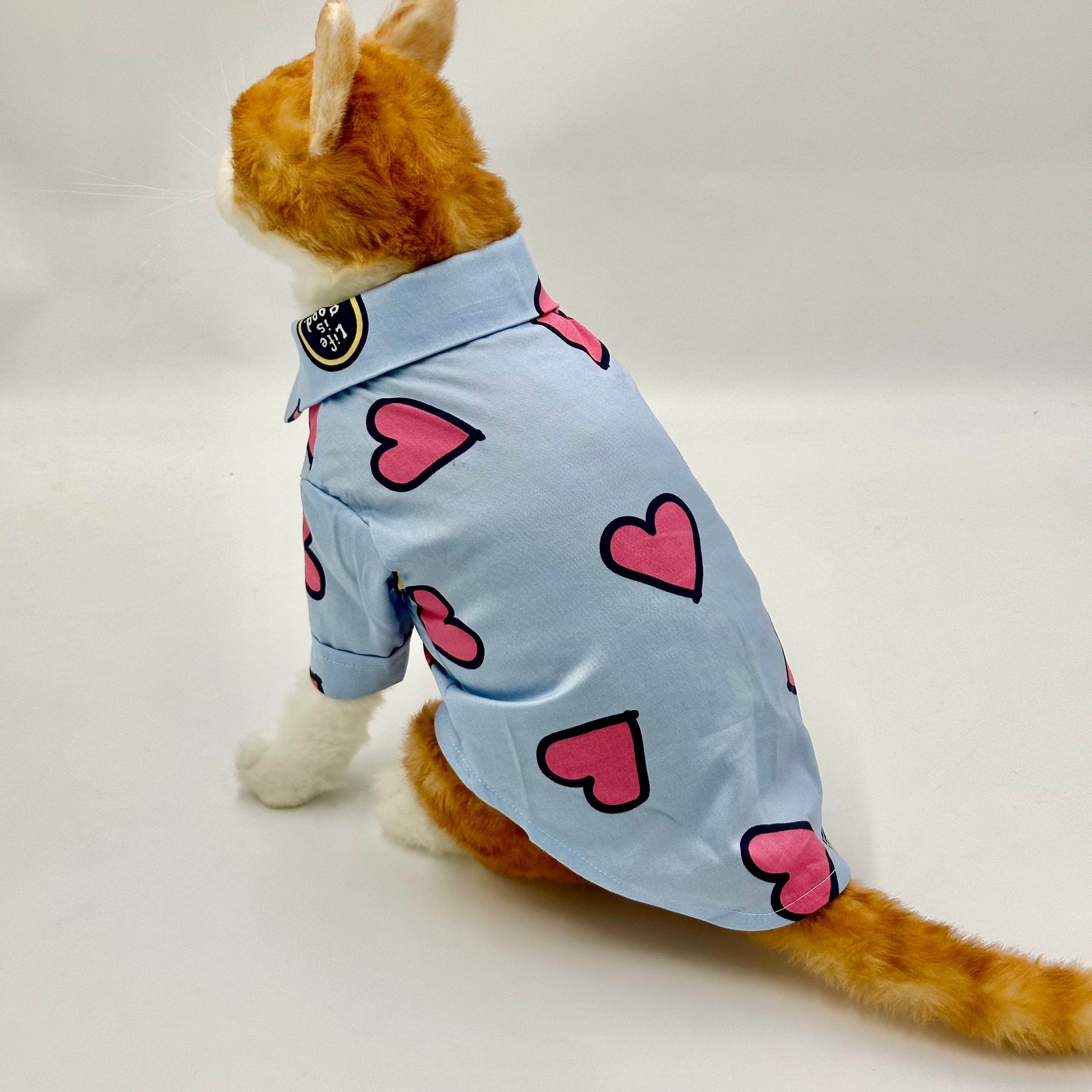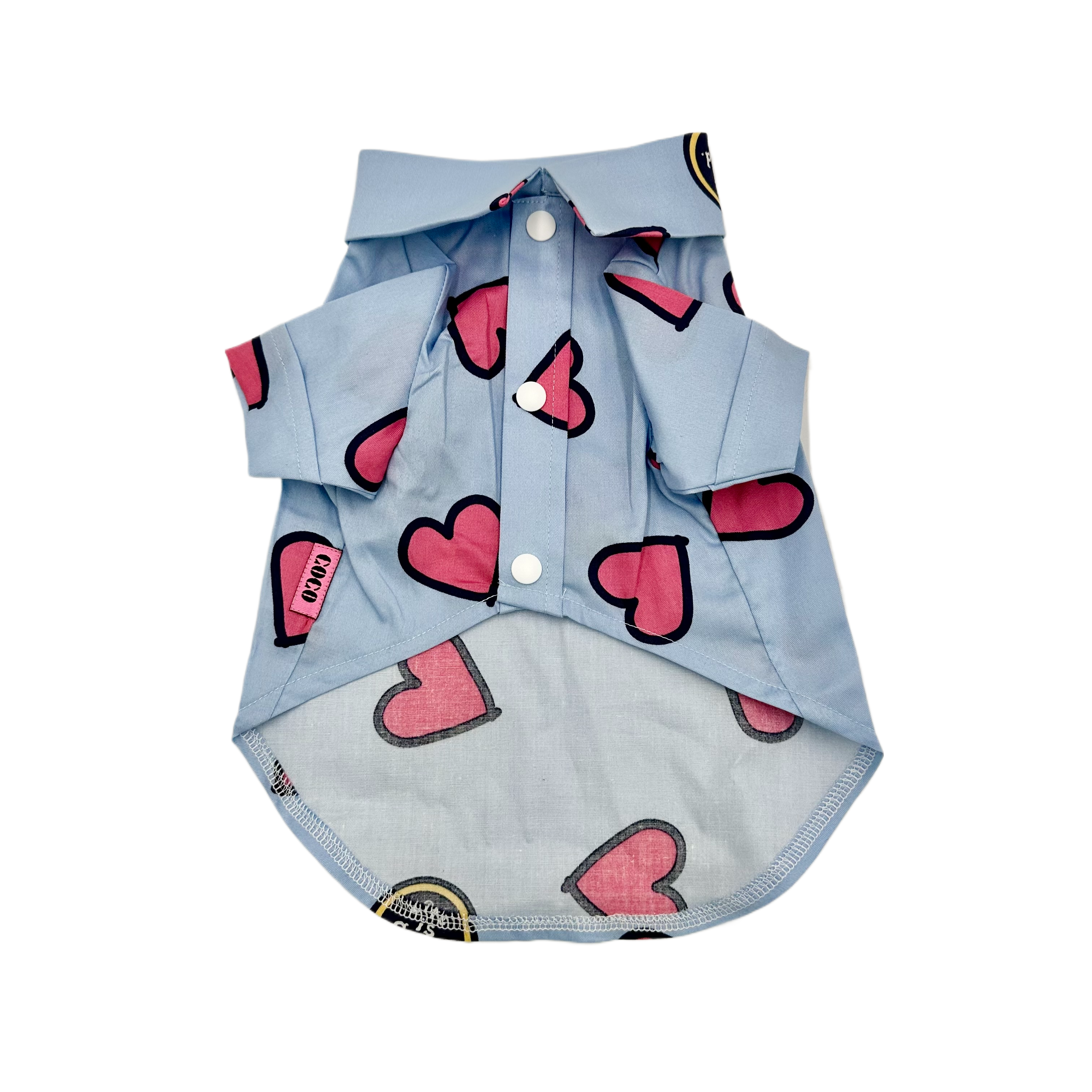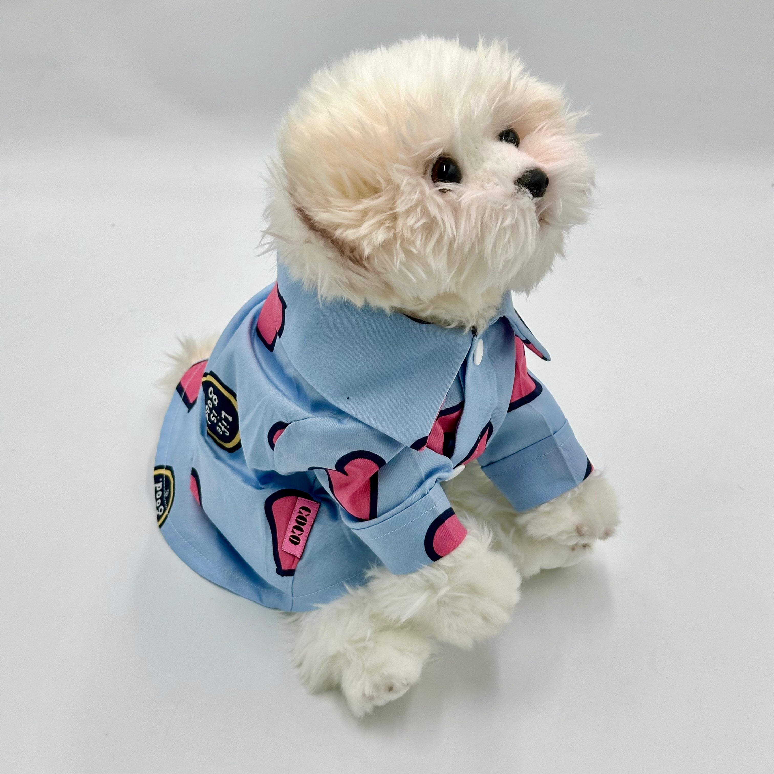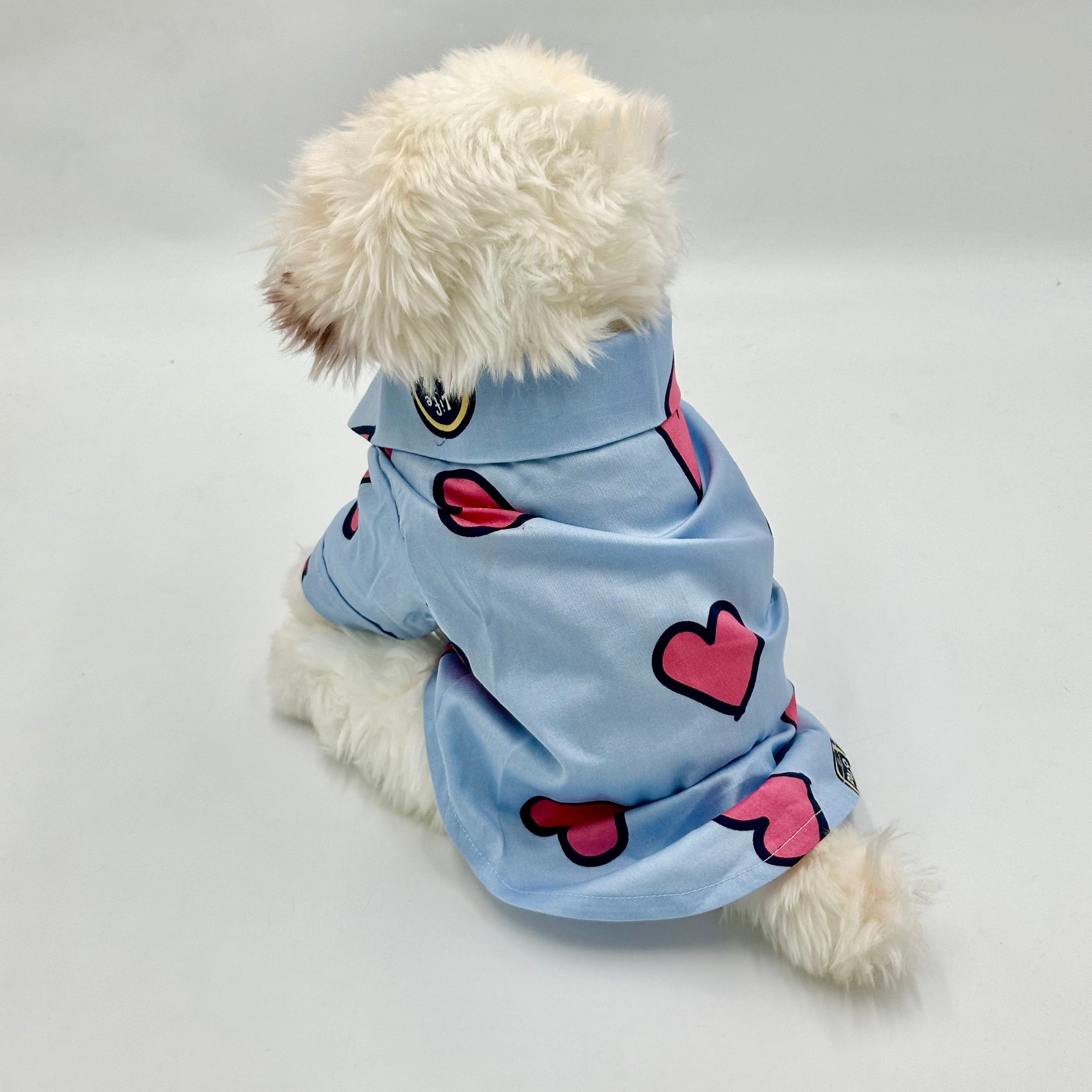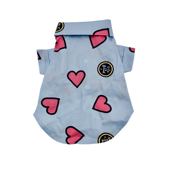 Sky-blue pet polo shirt with scattered pink hearts and yellow "Good Life" emblems, offering a sweet and cheerful look