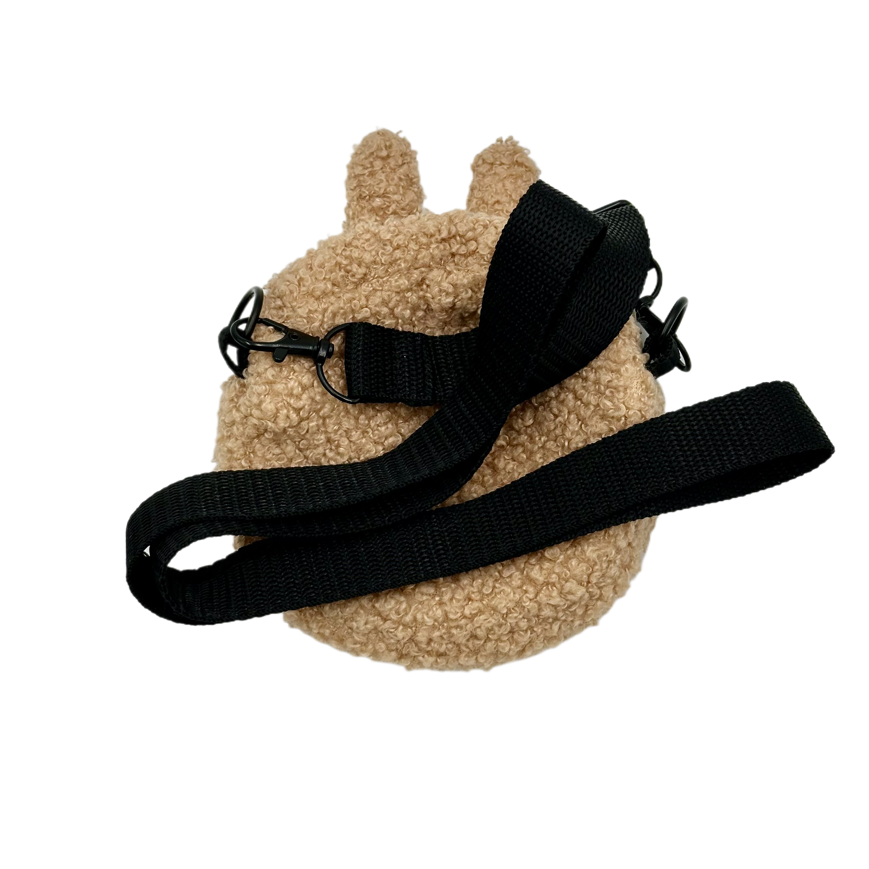 Adorable, fluffy beige coin purse shaped like a Labubu face with a wide smile and includes a convenient strap. 12cm diameter