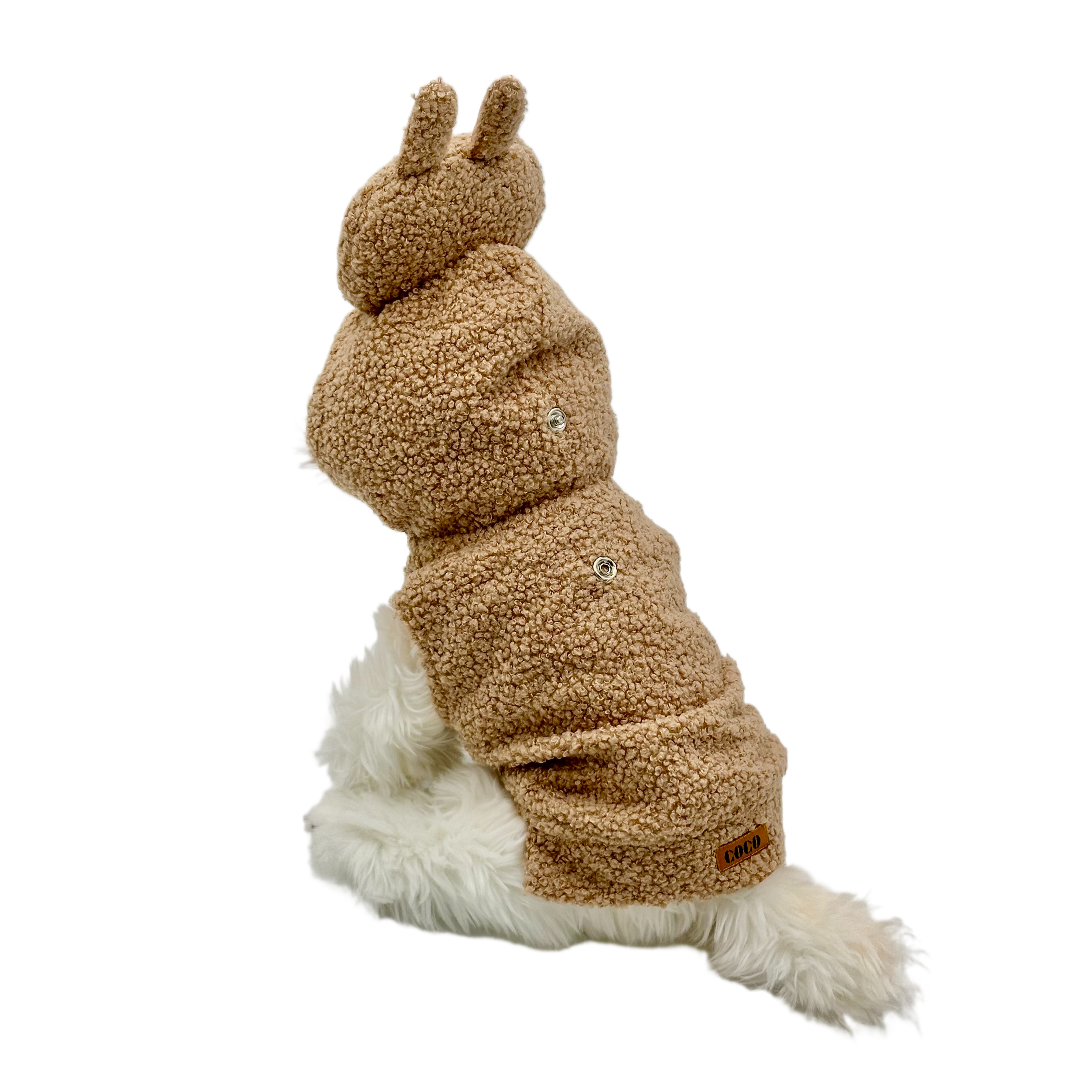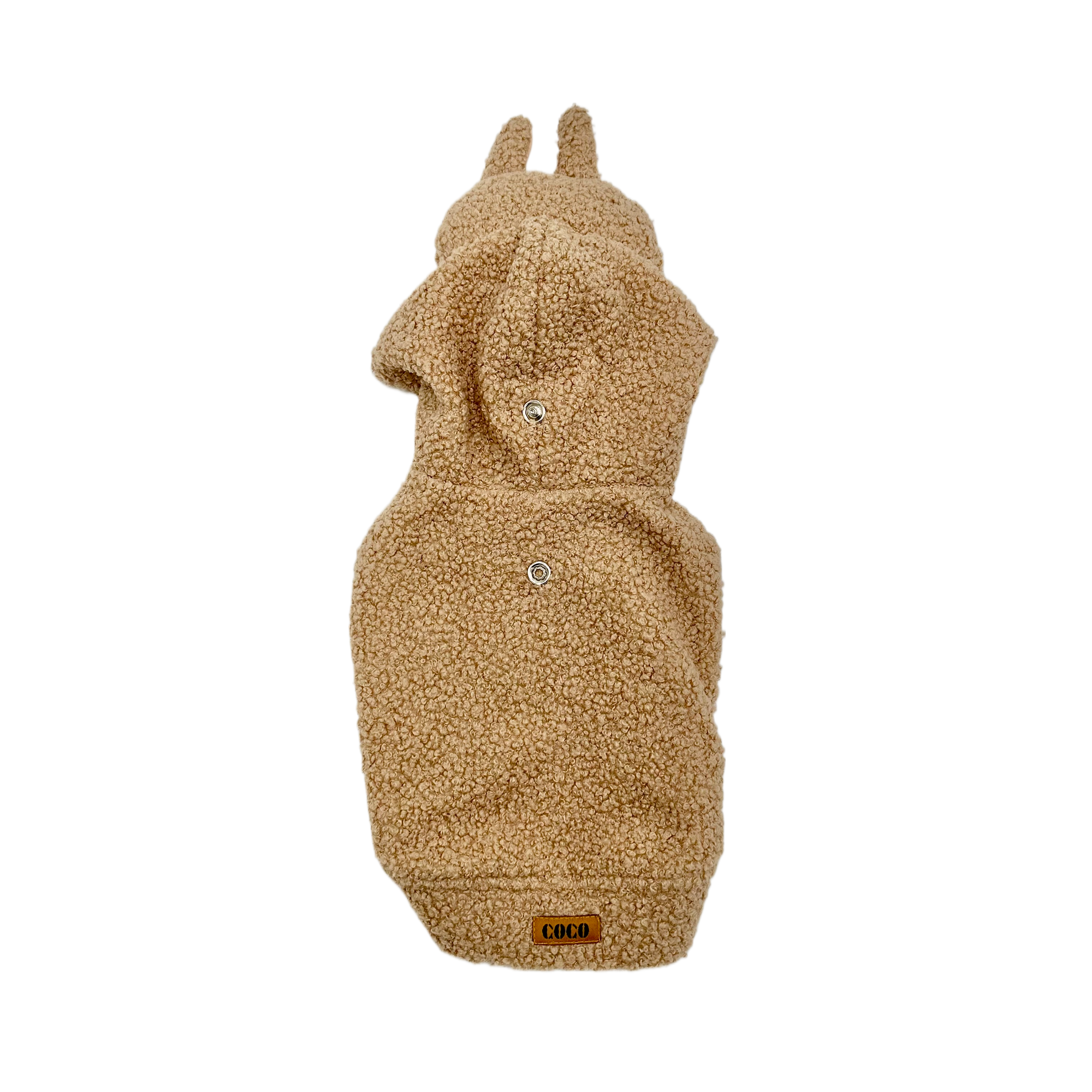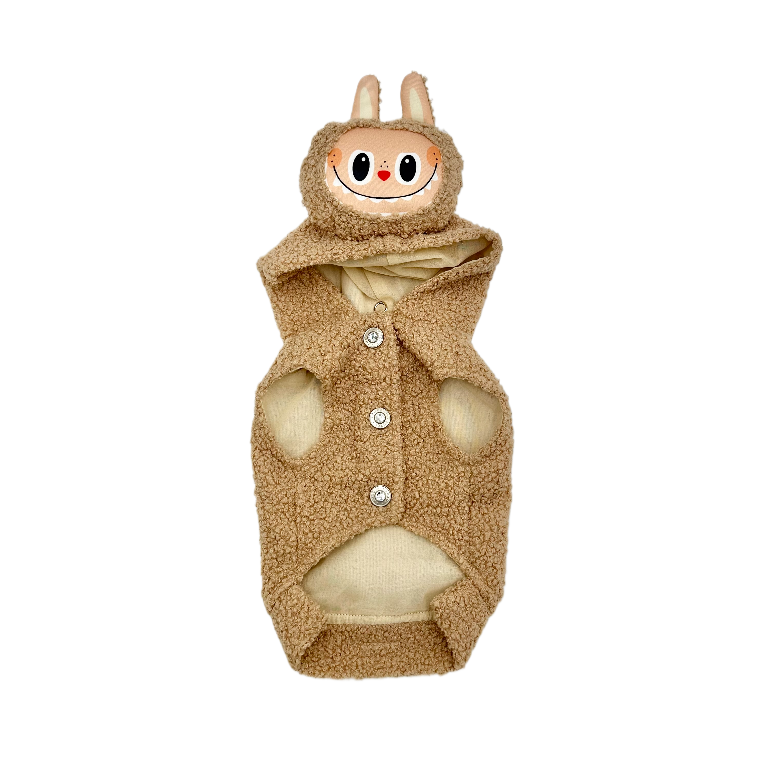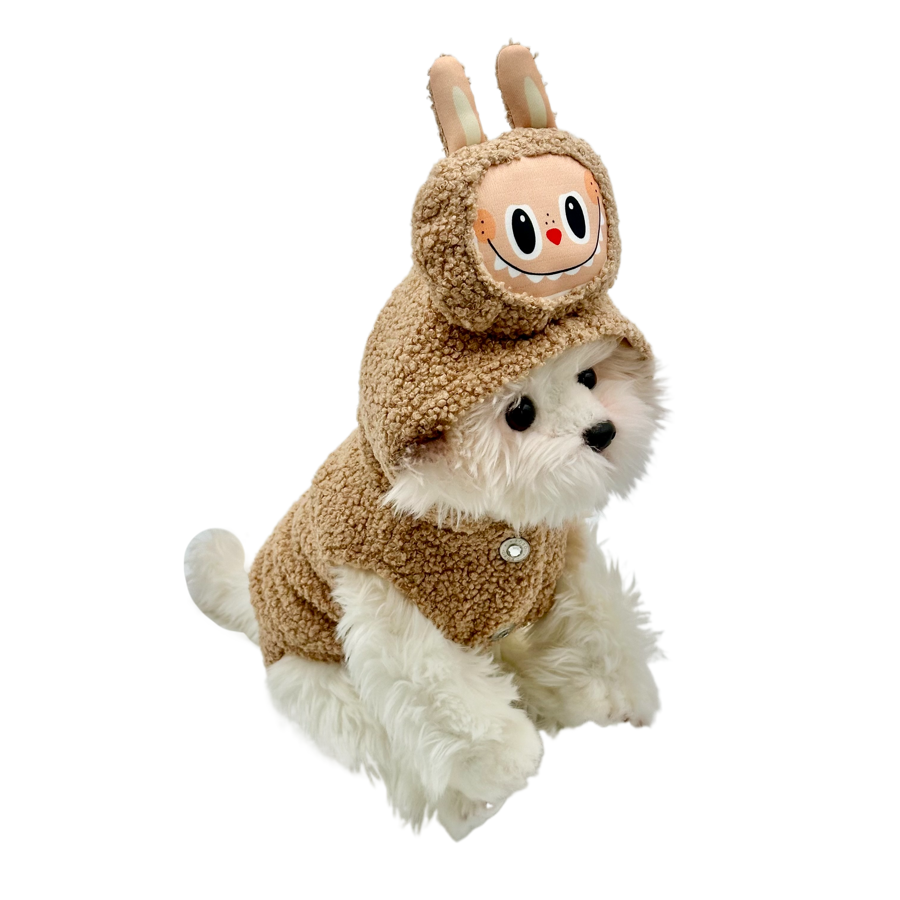 Beige pet hoodie with a cute Labubu face on the hood and practical buttons, perfect for a cozy, stylish look