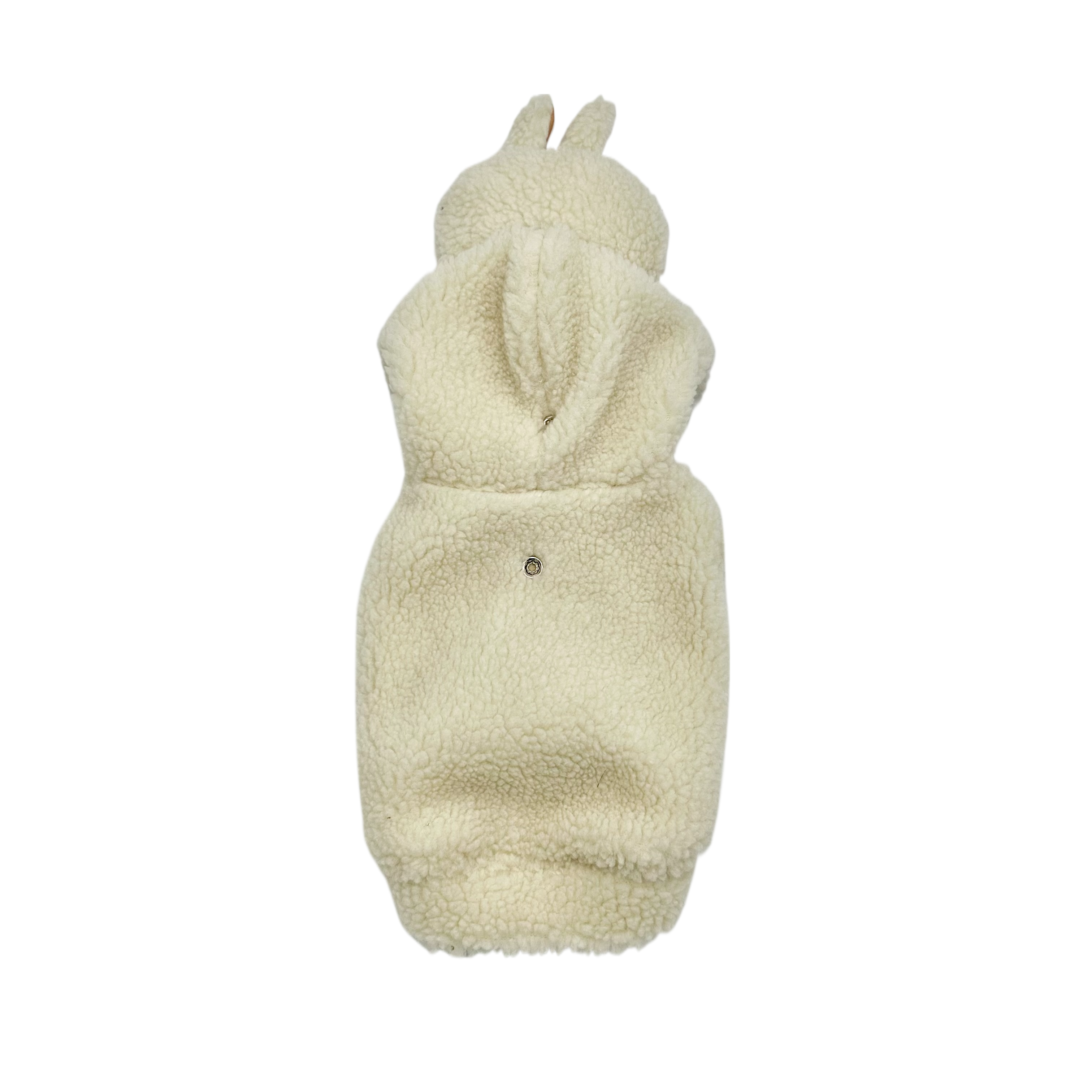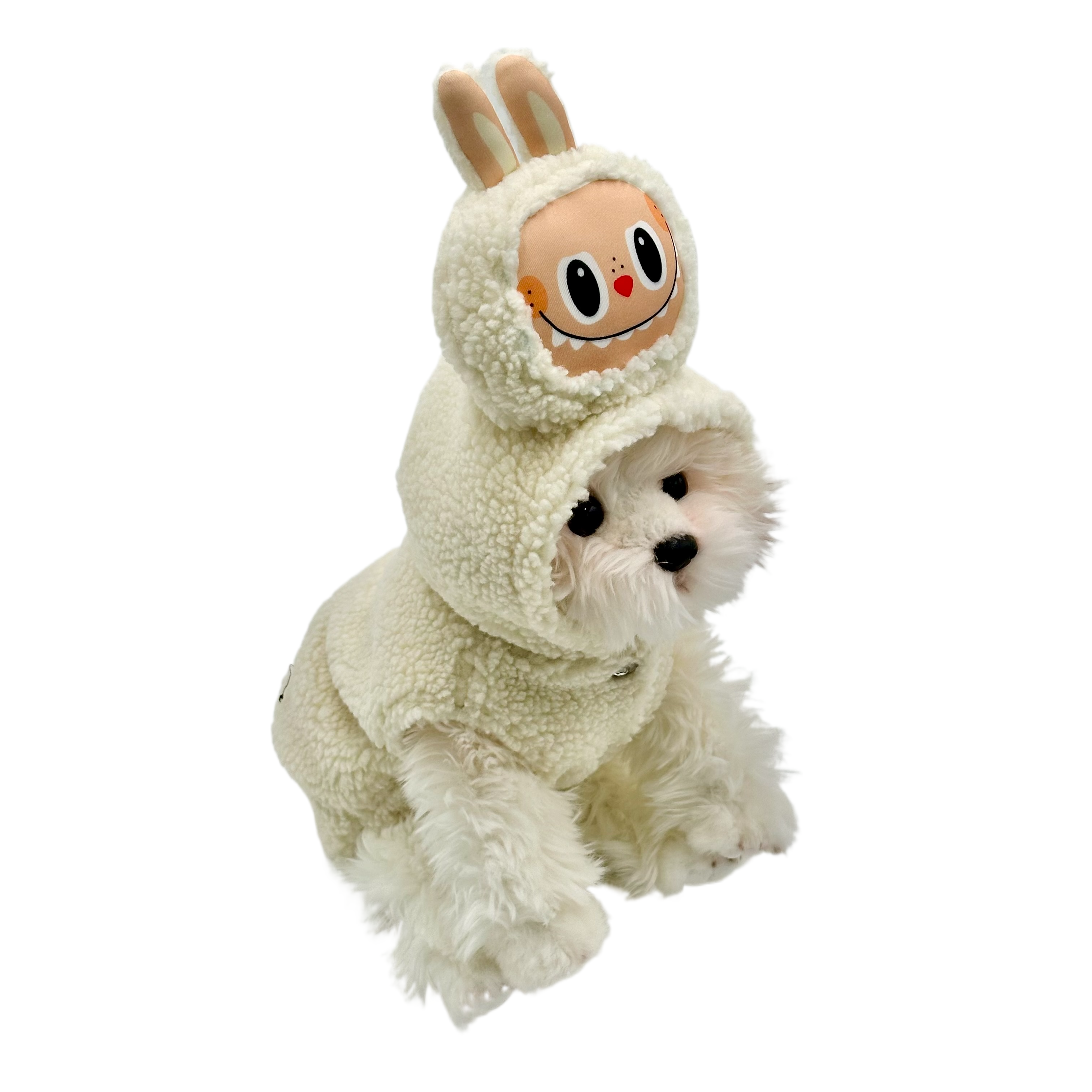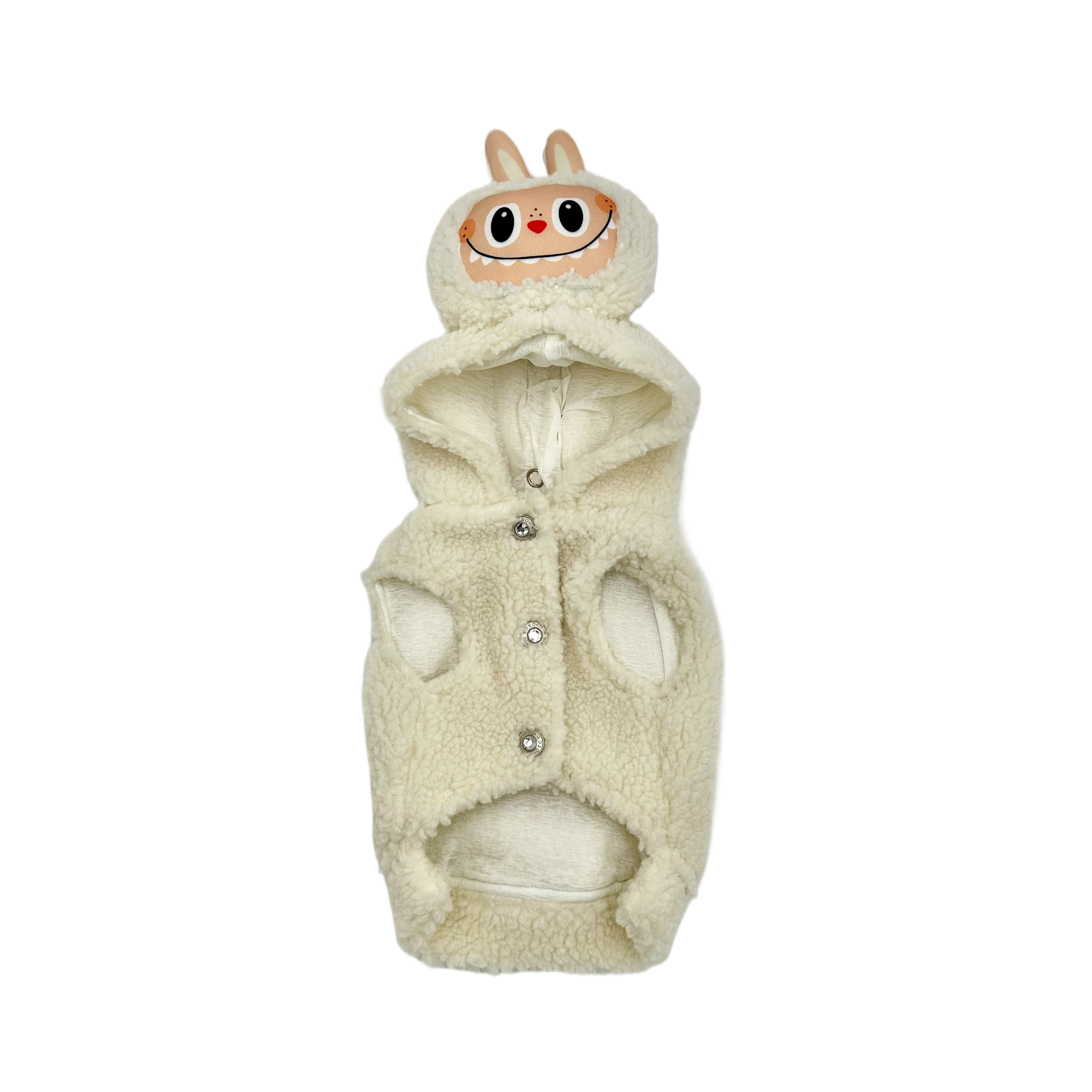 Cream colored pet hoodie with a cute Labubu face on the hood and practical buttons, perfect for a cozy, stylish look