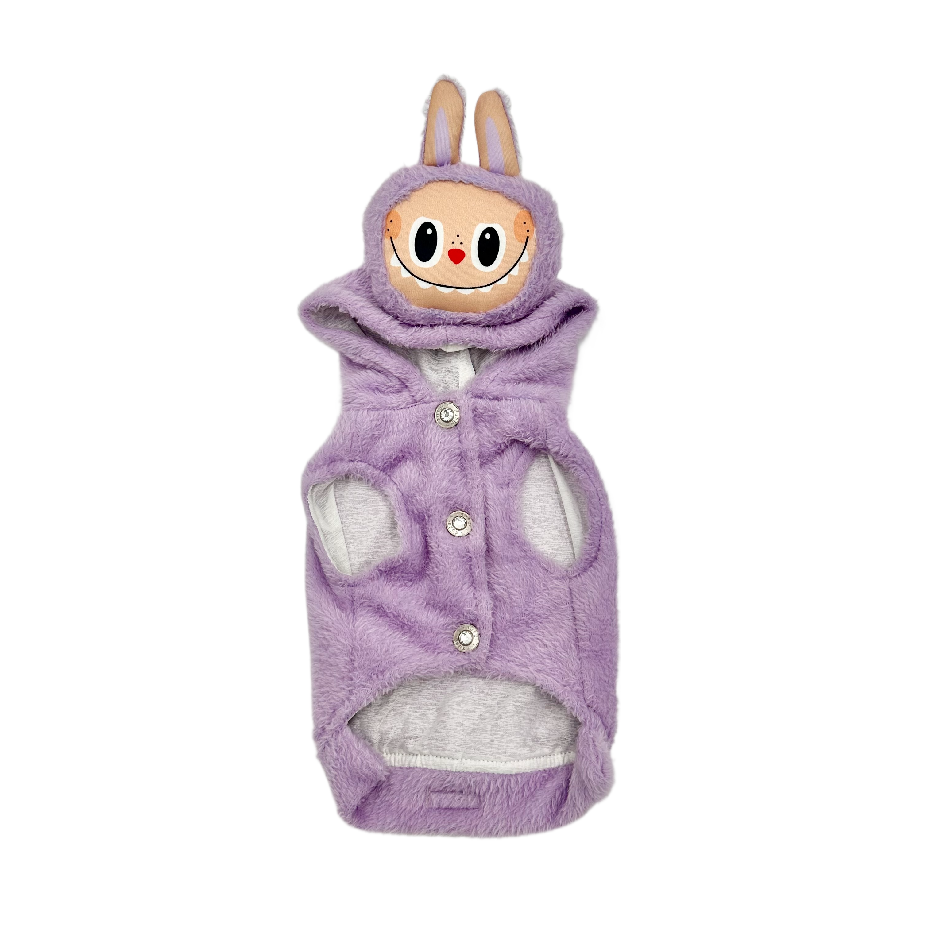 Violet pet hoodie with a cute Labubu face on the hood and practical buttons, perfect for a cozy, stylish look