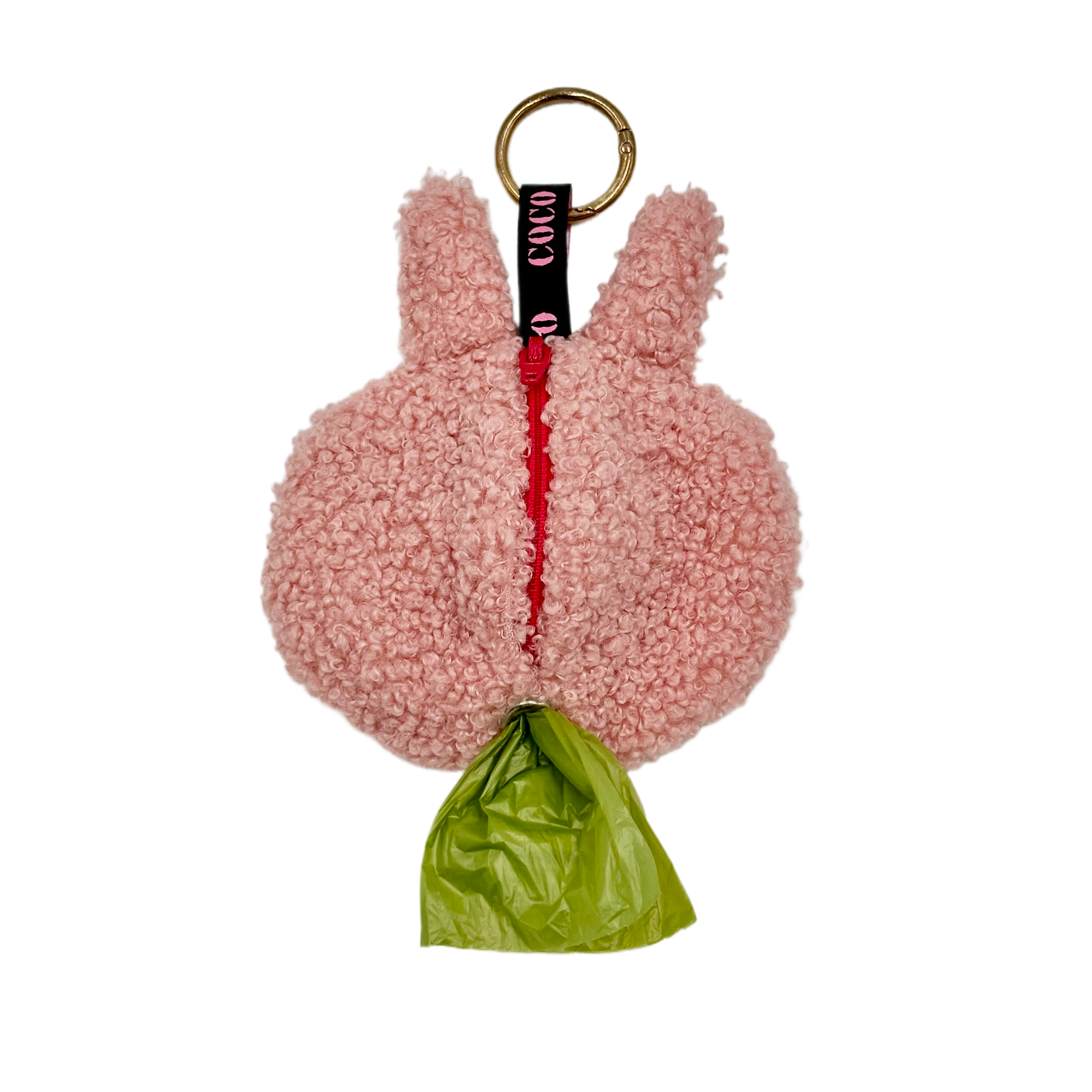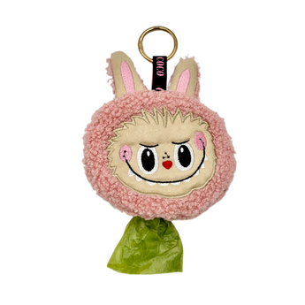 Cute, pink, fluffy pet poop bag shaped like Labubu face and has a keyring for easy attachment