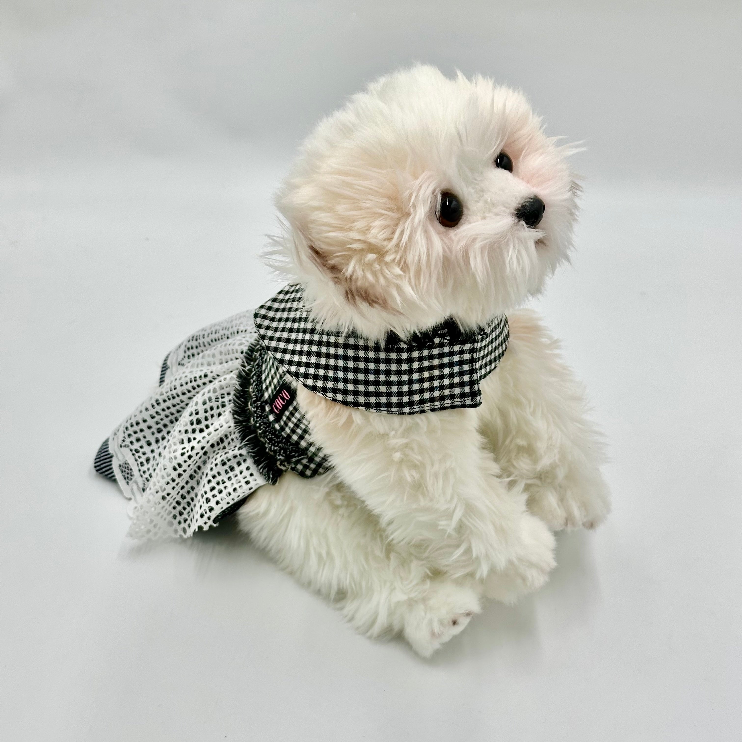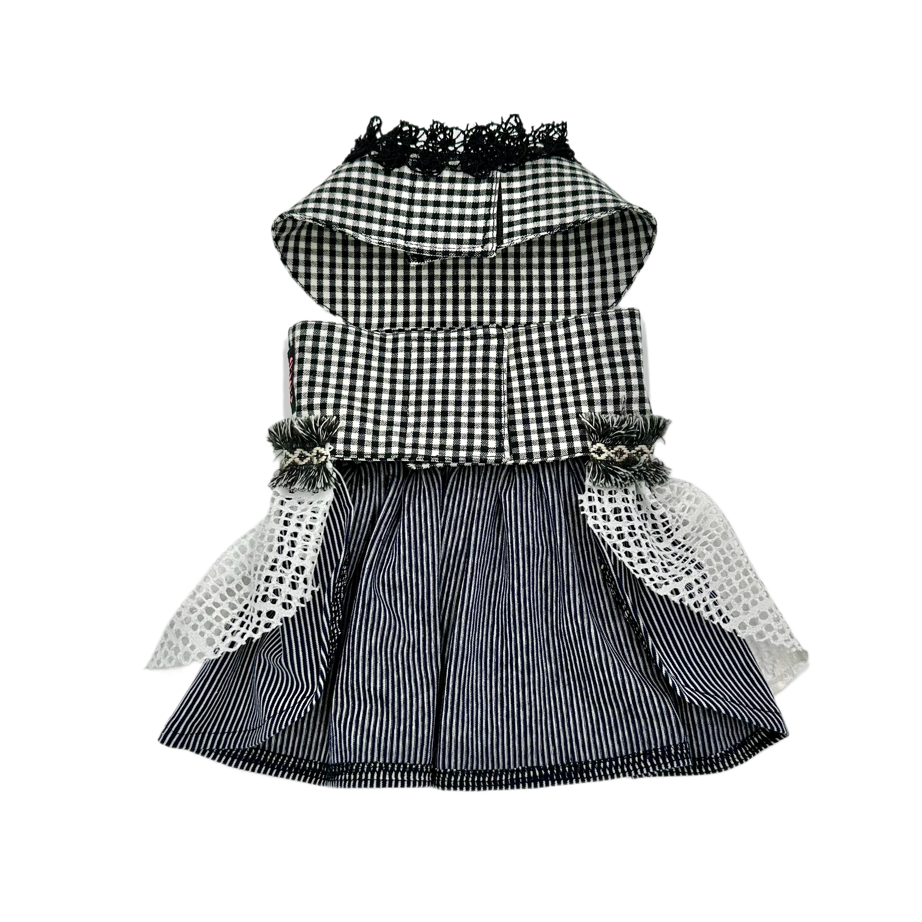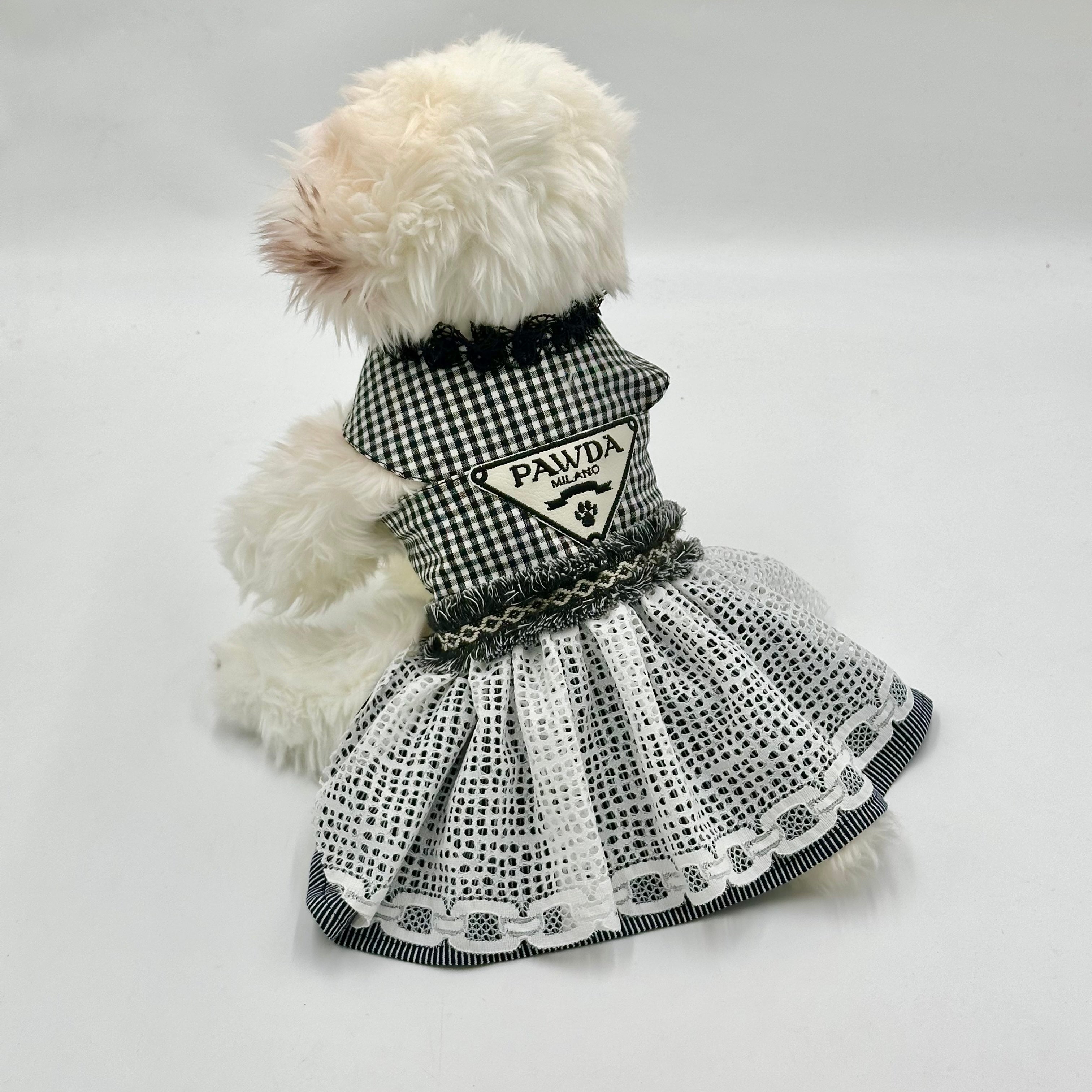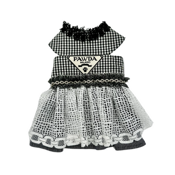 PAWDA Milano pet dress with a black and white gingham top, a frilly collar, and a tiered skirt with white lace and striped accents