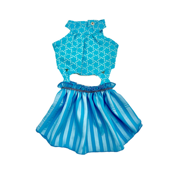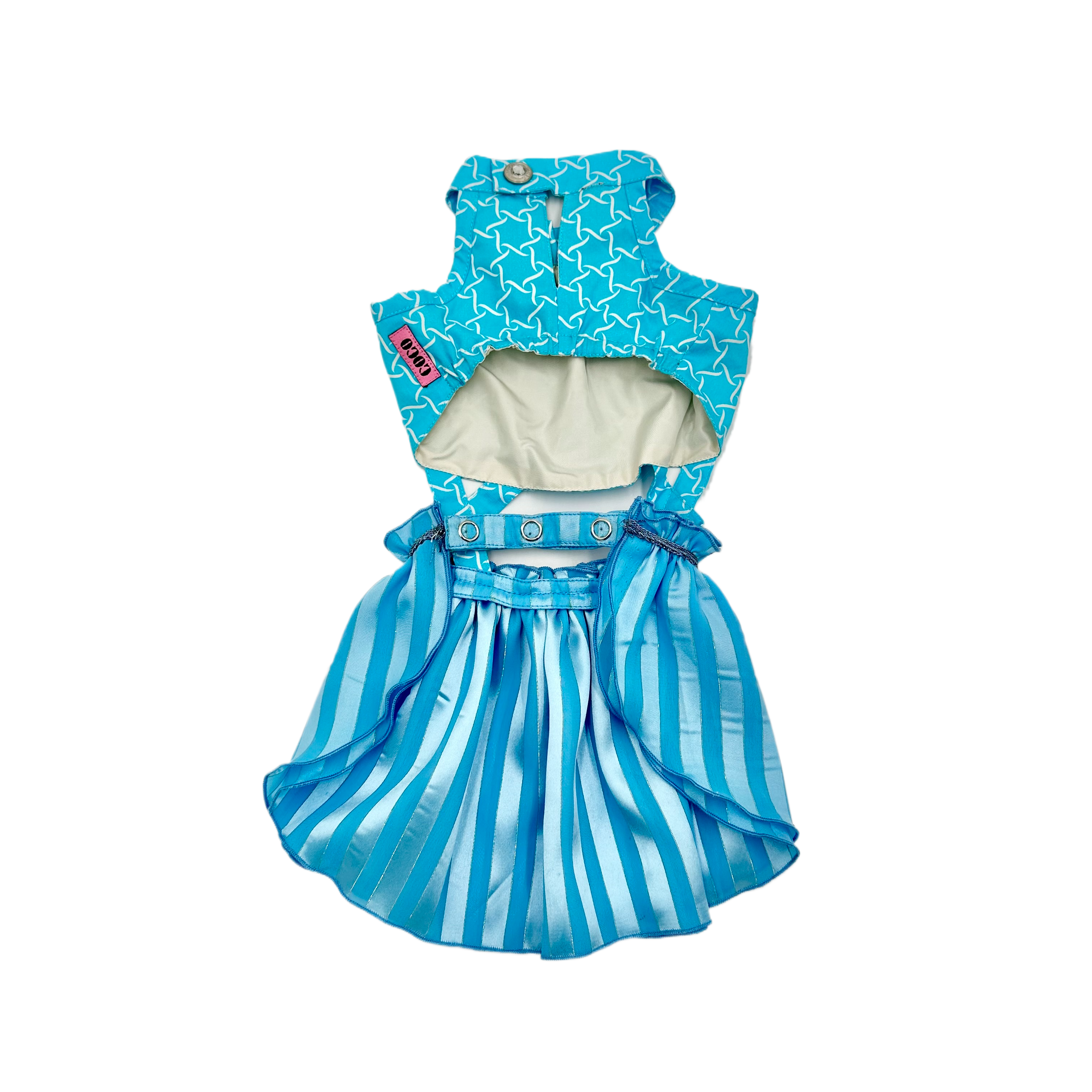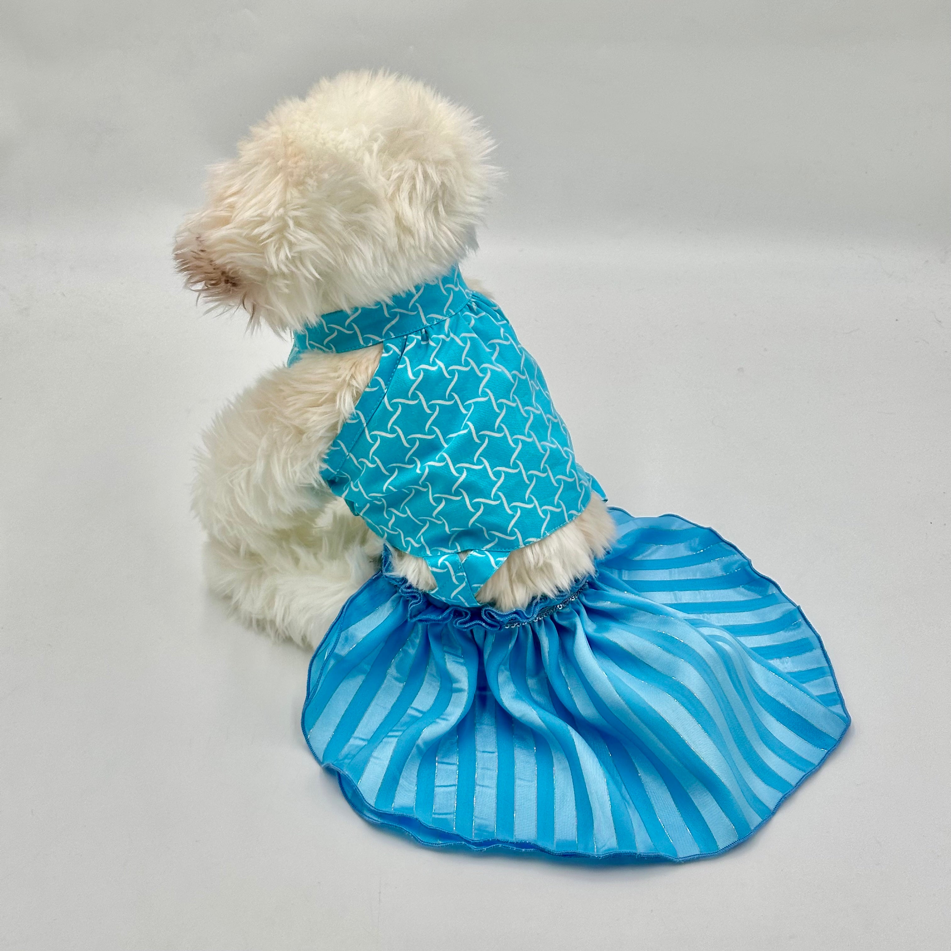 Charming blue pet dress with a patterned bodice with geometric shapes, a striped skirt, and a ruffled waist with silver trim