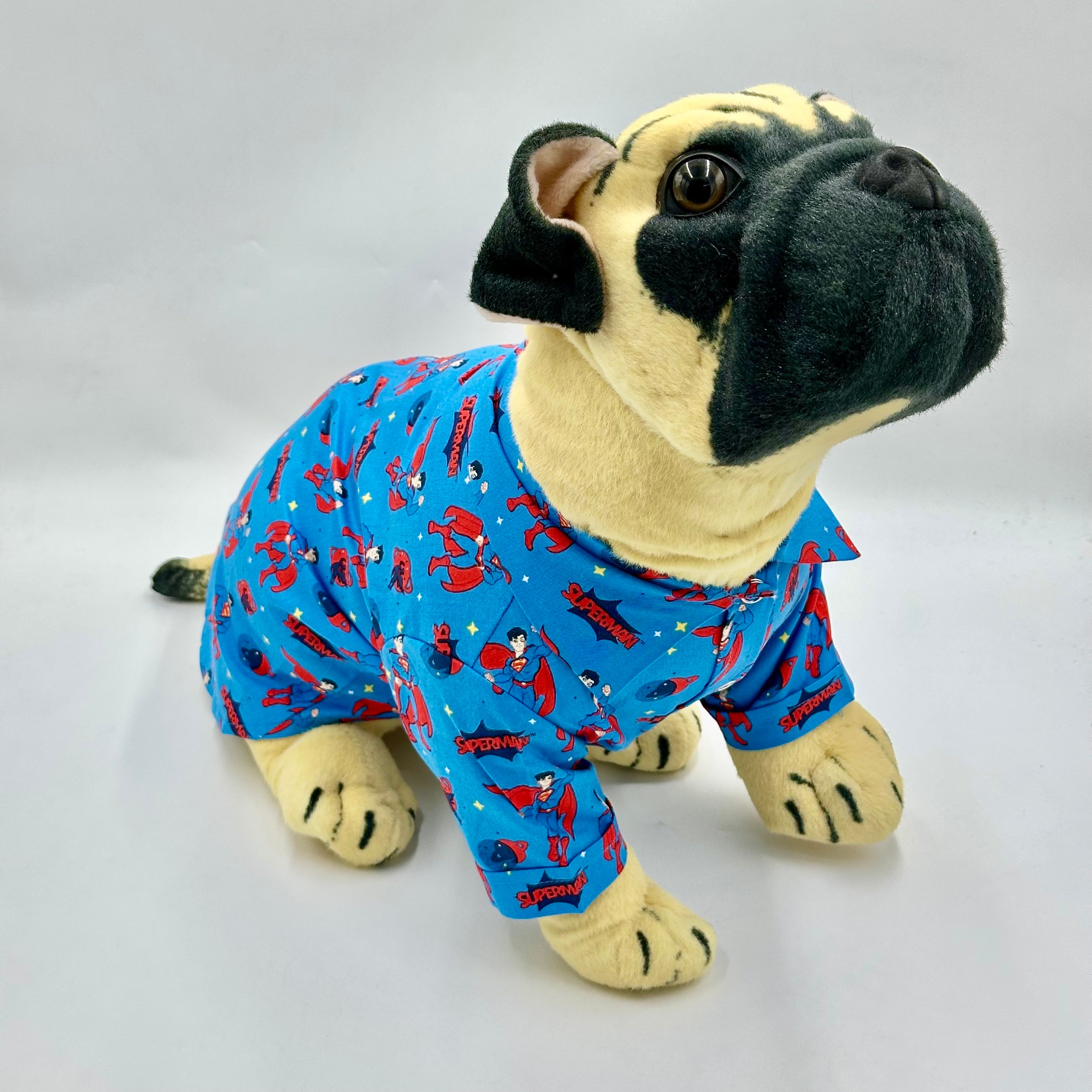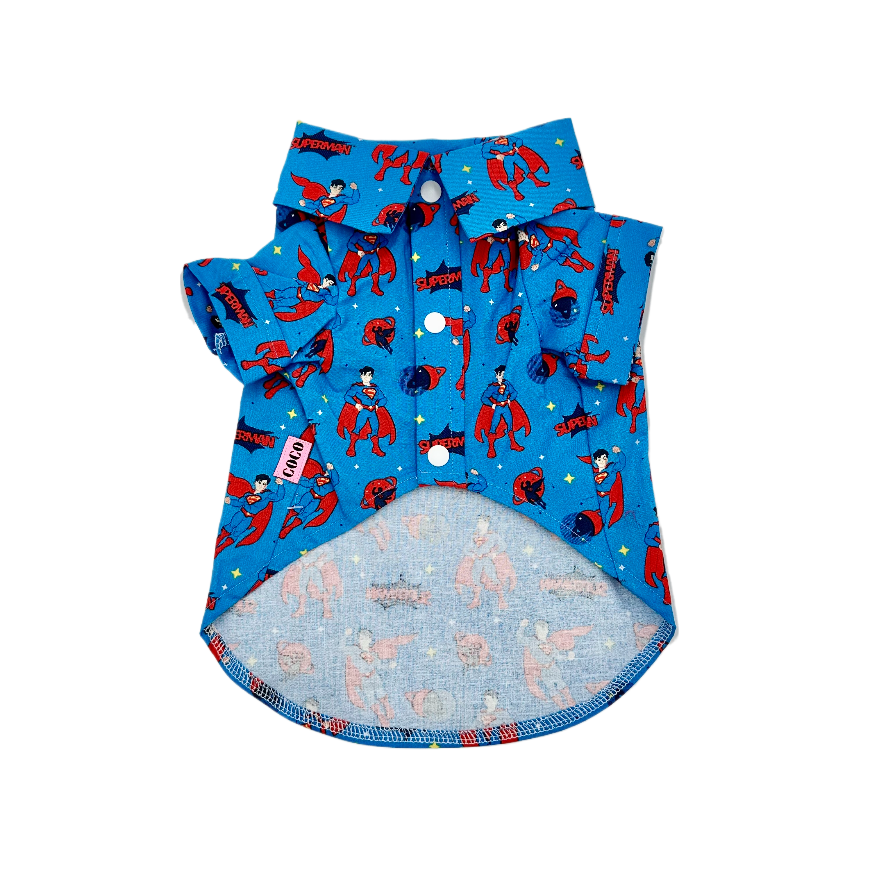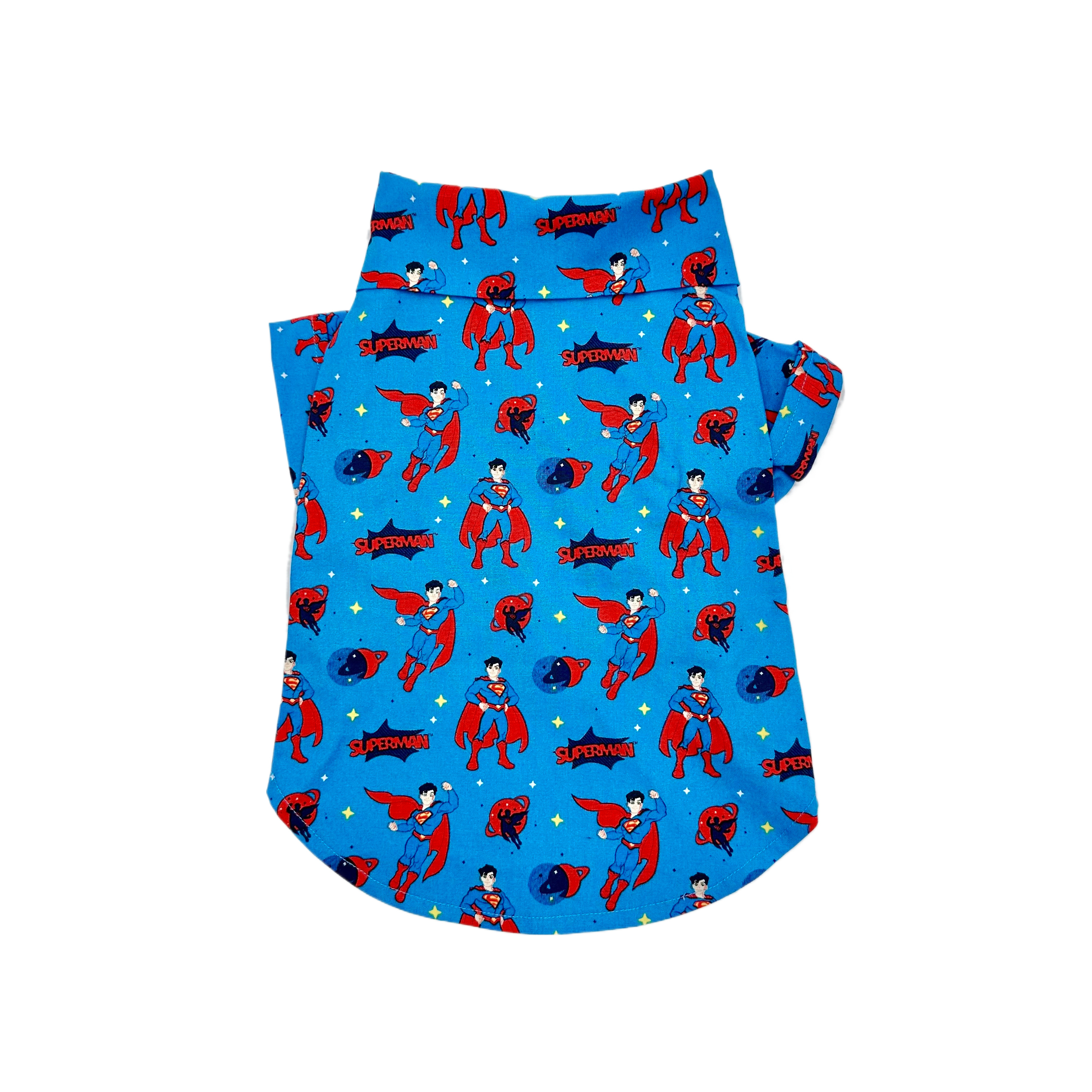 Blue pet polo with a fun Superman print, perfect for your pet to wear on any adventure