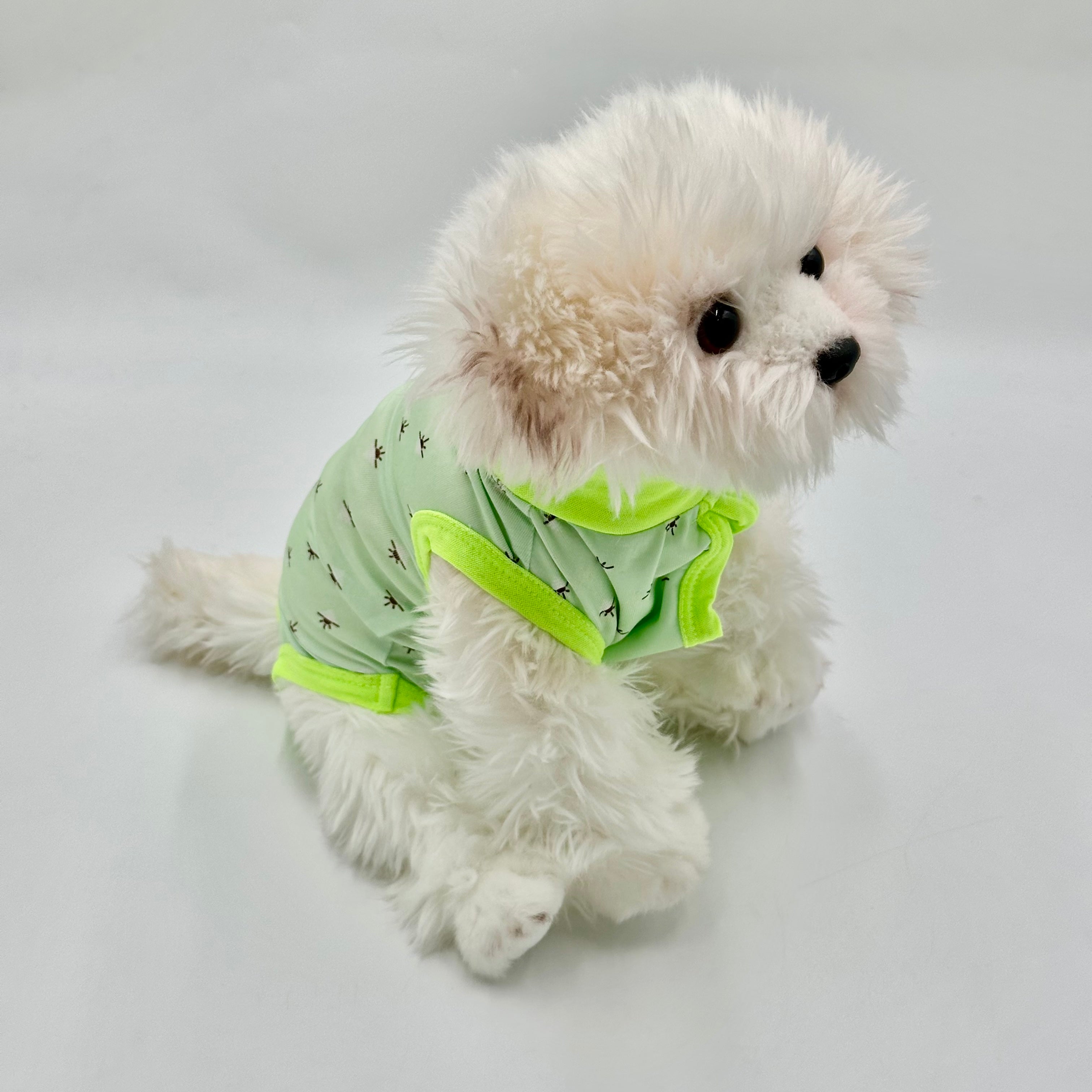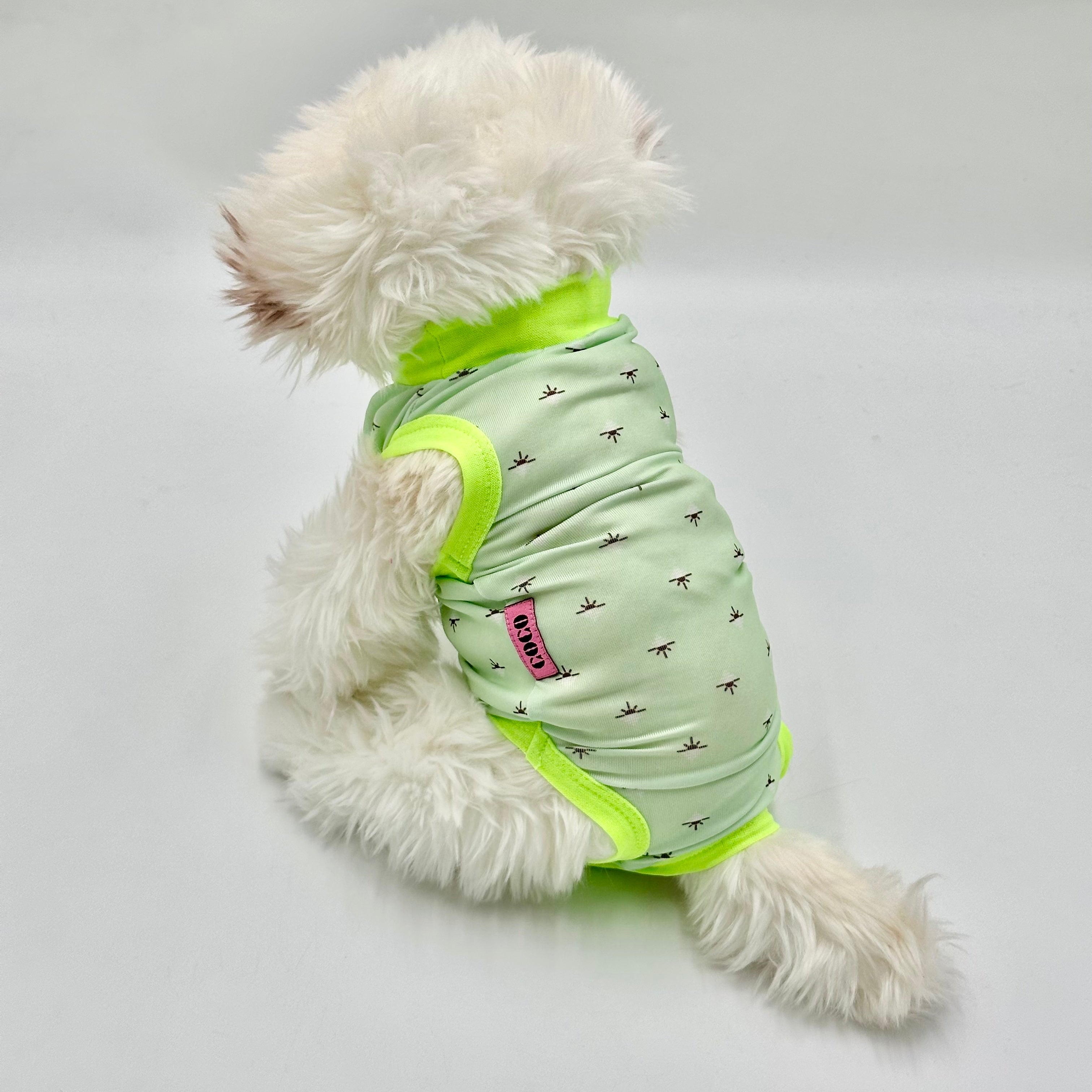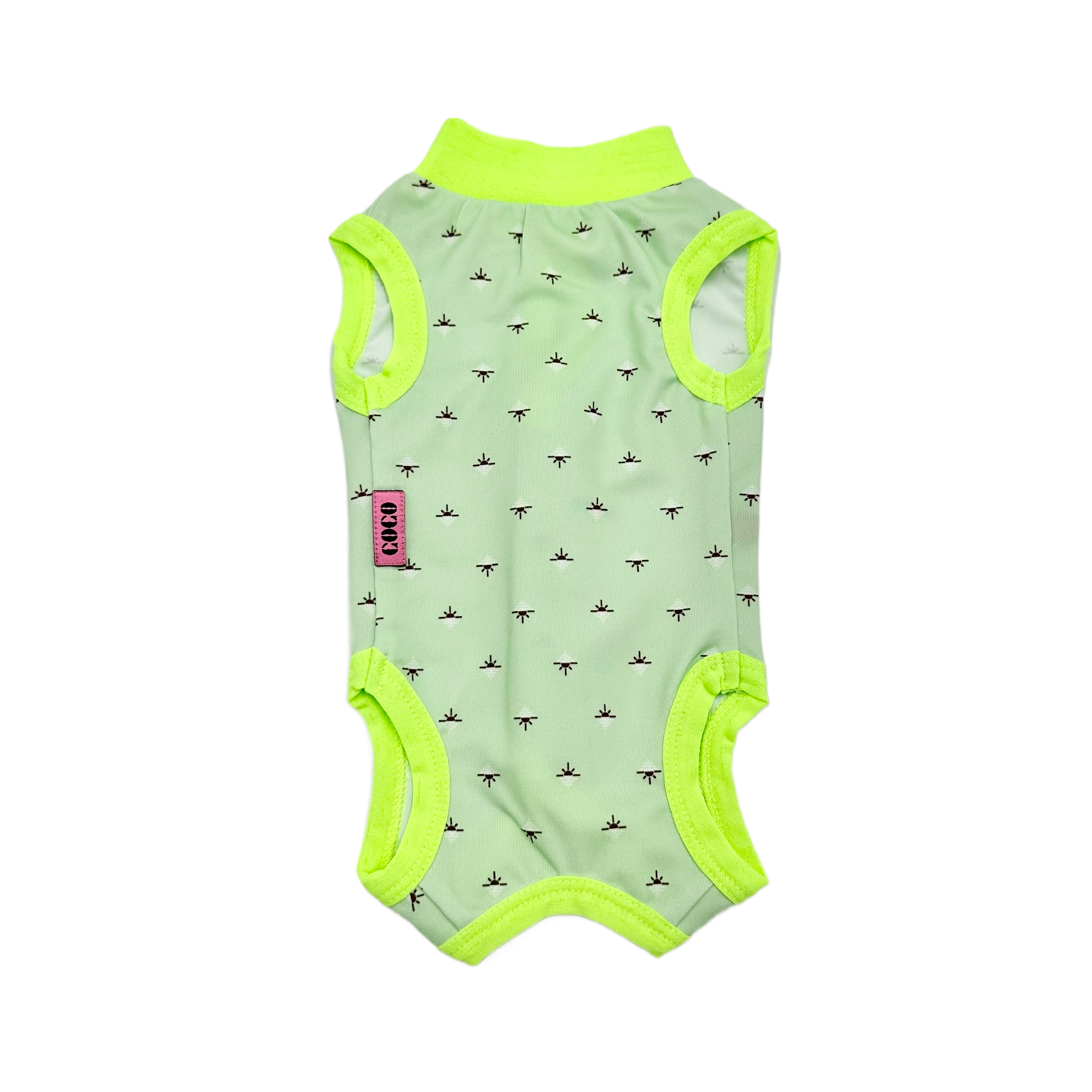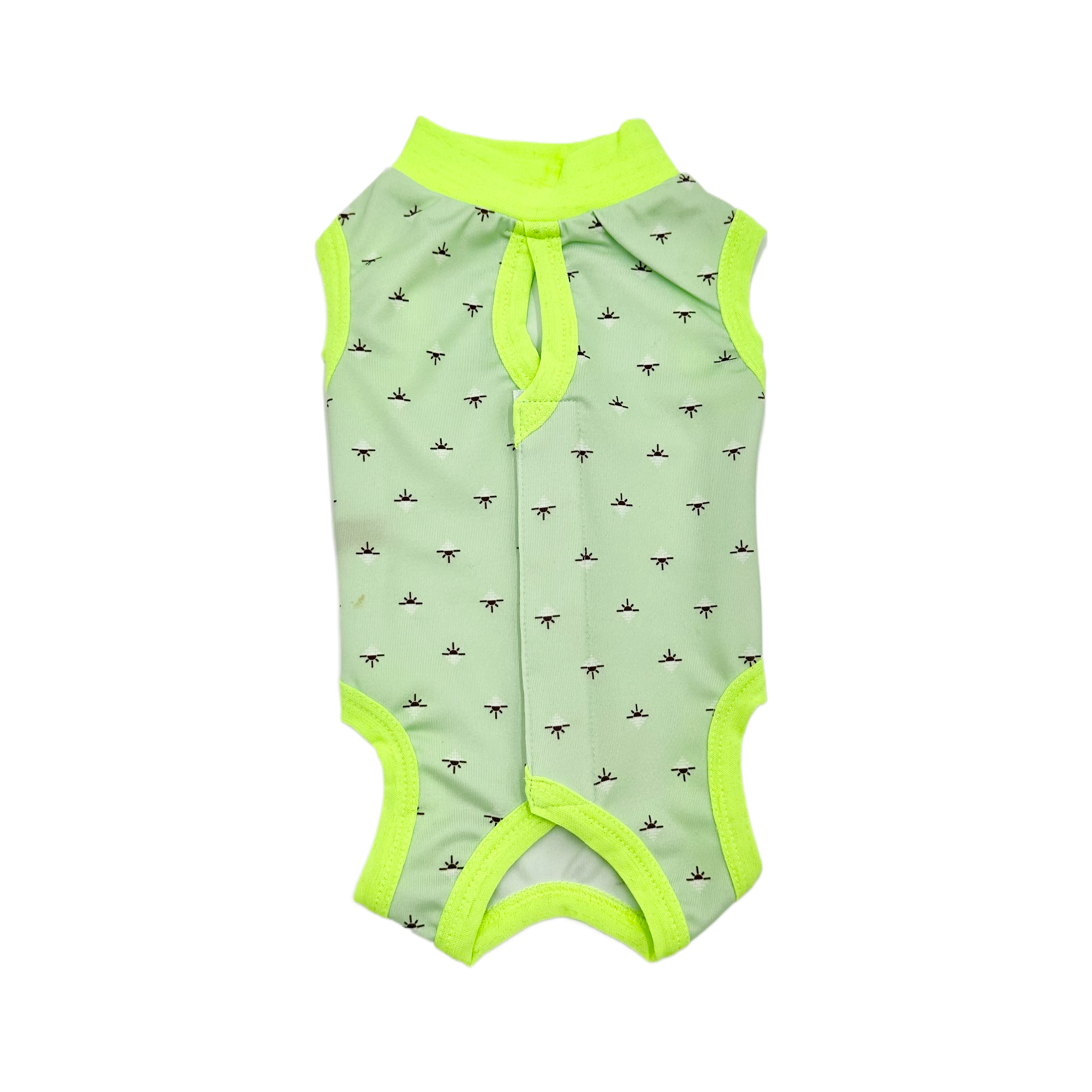 Comfortable neon green pet surgery suit, with light green trim, offers essential post-operative protection